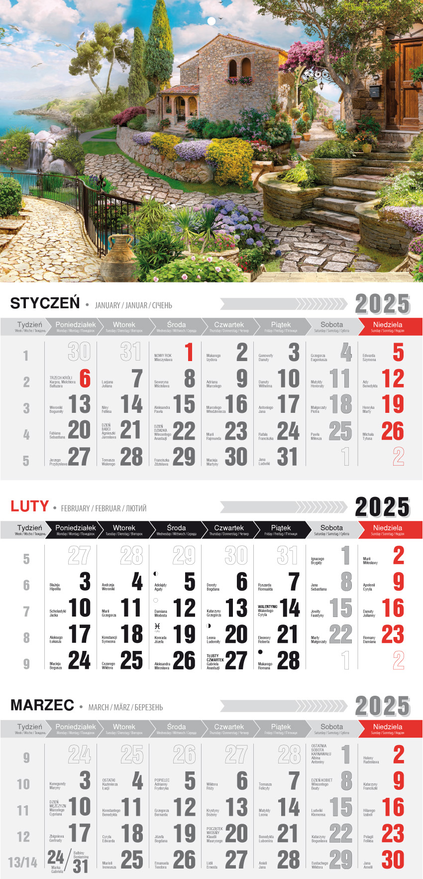 Kalendarz Trójdzielny Ekonomiczny JEDNOPLANSZOWY z przesuwnym okienkiem. Format 300/623mm. Główka z otworem wierconym . Dodatkowo nazwy miesiąca i dni tygodnia w języku Ukraińskim, Angielskim i Niemieckim. Kalendarium dodatkowo zawiera fazy księżyca i znaki zodiaku. Dużo miejsca do notowania, czytelne duże litery i cyfry. 12 kart do zrywania.