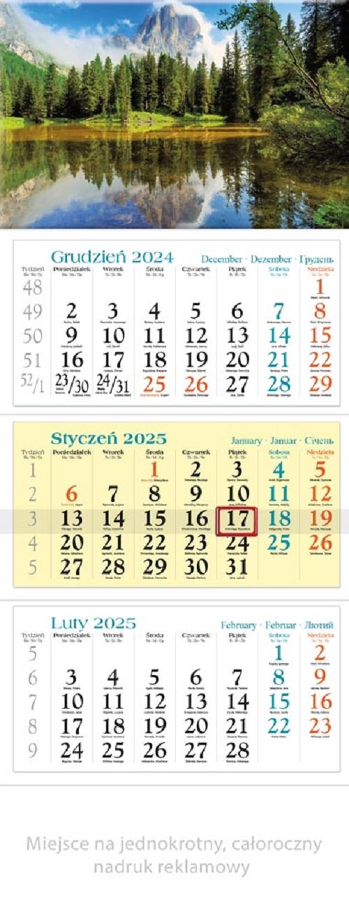 Specyfikacja kalendarzy trójdzielnych KT format kalendarza z "główką" i polem pod nadruk reklamowy 32 x 86 cm; kalendarze ścienne z całoroczną główką i zrywanymi kartami kalendarium; główka – format: 32 x 20 cm; oprawiona z efektem wypukłości, doklejona do pleców; kalendarium: trzy oddzielne bloczki (30 x 15 cm), doklejone do pleców; miesiąc bieżący wyróżniony kolorystycznie; podwójne imiona, bieżąca numeracja tygodni; kalendarium w języku polskim, angielskim, niemieckim i ukraińskim wysokość cyfr w głównym kalendarium: 14 mm papier: główka – karton 230 g/m2; plecy – karton 300 g/m2; kalendarium – papier offset 90 g/m2; druk: zdjęcie – jednostronny barwny + lakier UV błysk; kalendarium – jednostronny, barwny; pasek regulowany z czerwonym okienkiem; pod nadruk reklamowy: przedłużenie pleców poniżej kalendarium, z bigowaniem; brak możliwości nadruku pomiędzy kalendariami (ze względu na bigowanie); pole pod jednokrotny, całoroczny nadruk reklamowy: 32 x 12 cm; waga 1 egzemplarza – 350 g