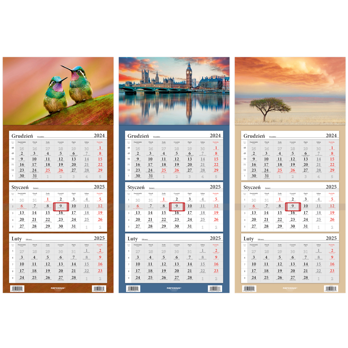Klasyczny kalendarz trójdzielny na 2025 rok, podłużny z wypukłą, elegancką główką oraz opaską z przesuwnym okienkiem do zaznaczenia obecnego dnia. Kalendarz można złożyć w 3 miejscach. Zawiera 3 odrębne, zrywane kalendaria po 12 kartek. Kalendarz jest zapakowany w folię ochronną. Sposób zawieszania - otwór w górnej części. Wymiar rozłożonego kalendarza to 32 x 67 cm. Wyprodukowano w Polsce.