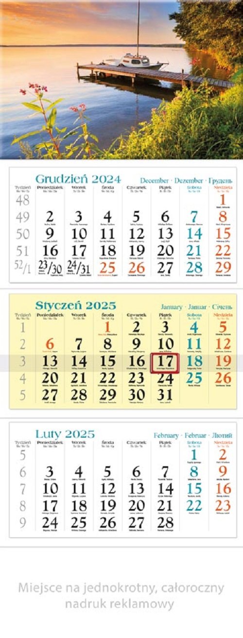 Specyfikacja kalendarzy trójdzielnych KT format kalendarza z "główką" i polem pod nadruk reklamowy 32 x 86 cm; kalendarze ścienne z całoroczną główką i zrywanymi kartami kalendarium; główka – format: 32 x 20 cm; oprawiona z efektem wypukłości, doklejona do pleców; kalendarium: trzy oddzielne bloczki (30 x 15 cm), doklejone do pleców; miesiąc bieżący wyróżniony kolorystycznie; podwójne imiona, bieżąca numeracja tygodni; kalendarium w języku polskim, angielskim, niemieckim i ukraińskim wysokość cyfr w głównym kalendarium: 14 mm papier: główka – karton 230 g/m2; plecy – karton 300 g/m2; kalendarium – papier offset 90 g/m2; druk: zdjęcie – jednostronny barwny + lakier UV błysk; kalendarium – jednostronny, barwny; pasek regulowany z czerwonym okienkiem; pod nadruk reklamowy: przedłużenie pleców poniżej kalendarium, z bigowaniem; brak możliwości nadruku pomiędzy kalendariami (ze względu na bigowanie); pole pod jednokrotny, całoroczny nadruk reklamowy: 32 x 12 cm; waga 1 egzemplarza – 350 g