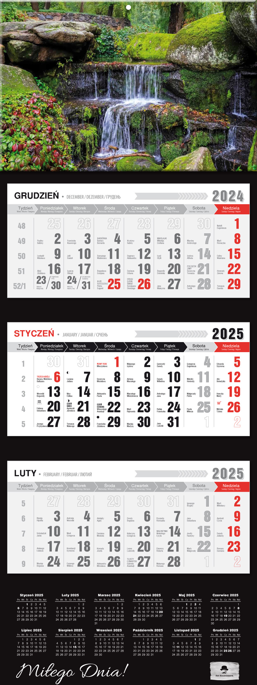 Kalendarz Trójdzielny PREMIUM Z WYPUKŁĄ GŁÓWKĄ. Format 315/810mm. Trzy komplety klasycznych kalendariów z przesuwnym okienkiem. Główka z otworem wierconym. Dodatkowo nazwy miesiąca i dni tygodnia w języku Ukraińskim, Angielskim i Niemieckim. Kalendarium dodatkowo zawiera fazy księżyca i znaki zodiaku. Dużo miejsca do notowania, czytelne duże litery i cyfry. DODATKOWO PRZEDŁUŻONE PLECKI KOLOREM DOPASOWANE DO WZORU ZE SKRÓCONYM KALENDARIUM NA ROK 2025.