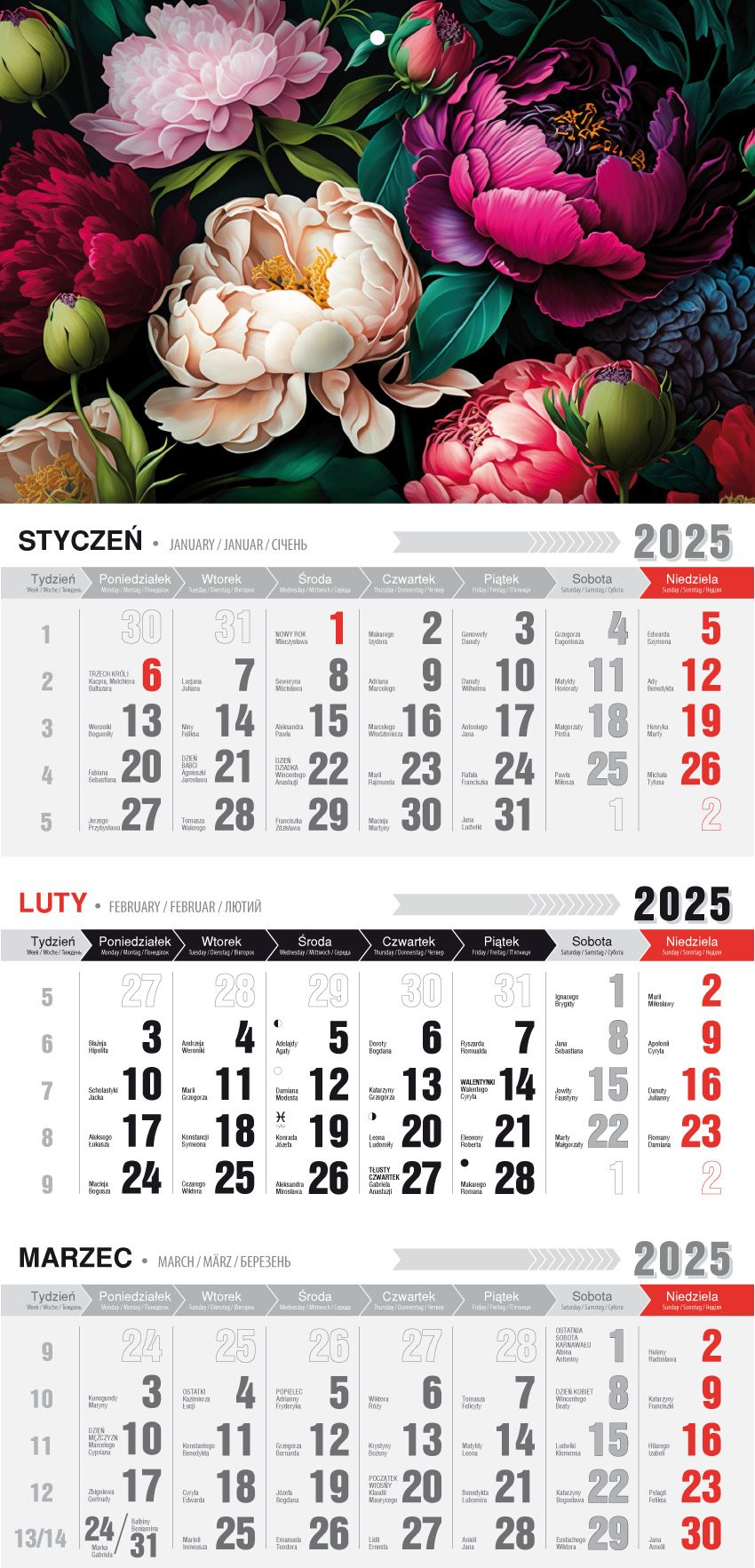 Kalendarz 2025 Trójdzielny z magnesem Kwiaty