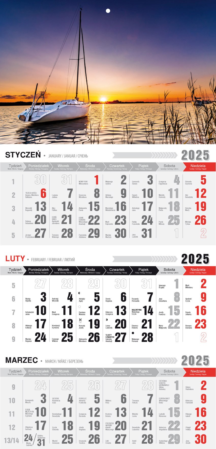 Kalendarz Trójdzielny JEDNOPLANSZOWY Z MAGNESEM , z przesuwnym okienkiem. Format 300/623mm. Kalendaria w języku PL, EN, DE i UA. Główka z otworem wierconym oraz magnesem to doskonała propozycja do przyczepienia na lodówkę. Dodatkowo nazwy miesiąca i dni tygodnia w języku Ukraińskim, Angielskim i Niemieckim. Kalendarium dodatkowo zawiera fazy księżyca i znaki zodiaku. Dużo miejsca do notowania, czytelne duże litery i cyfry. 12 kart do zrywania.