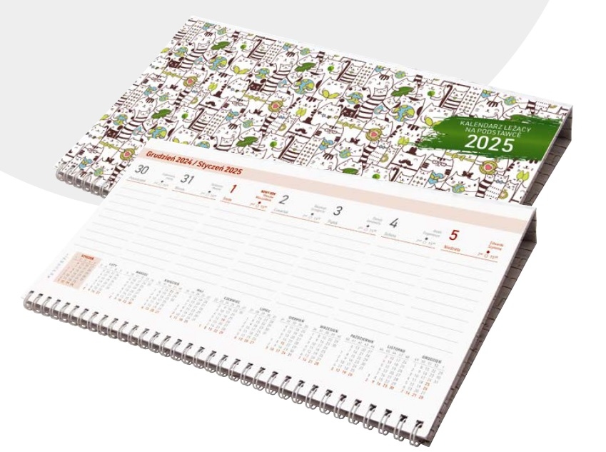 Kalendarz leżący na podstawce z kalendarium w układzie tygodniowym poziomym. Zaprojektowany specjalnie do biura. Istnieje możliwość założenia indywidualnej okładki. Zawiera przejrzyste kalendarium w układzie tygodniowym poziomym oraz część informacyjną. Grzbiet spiralowany.