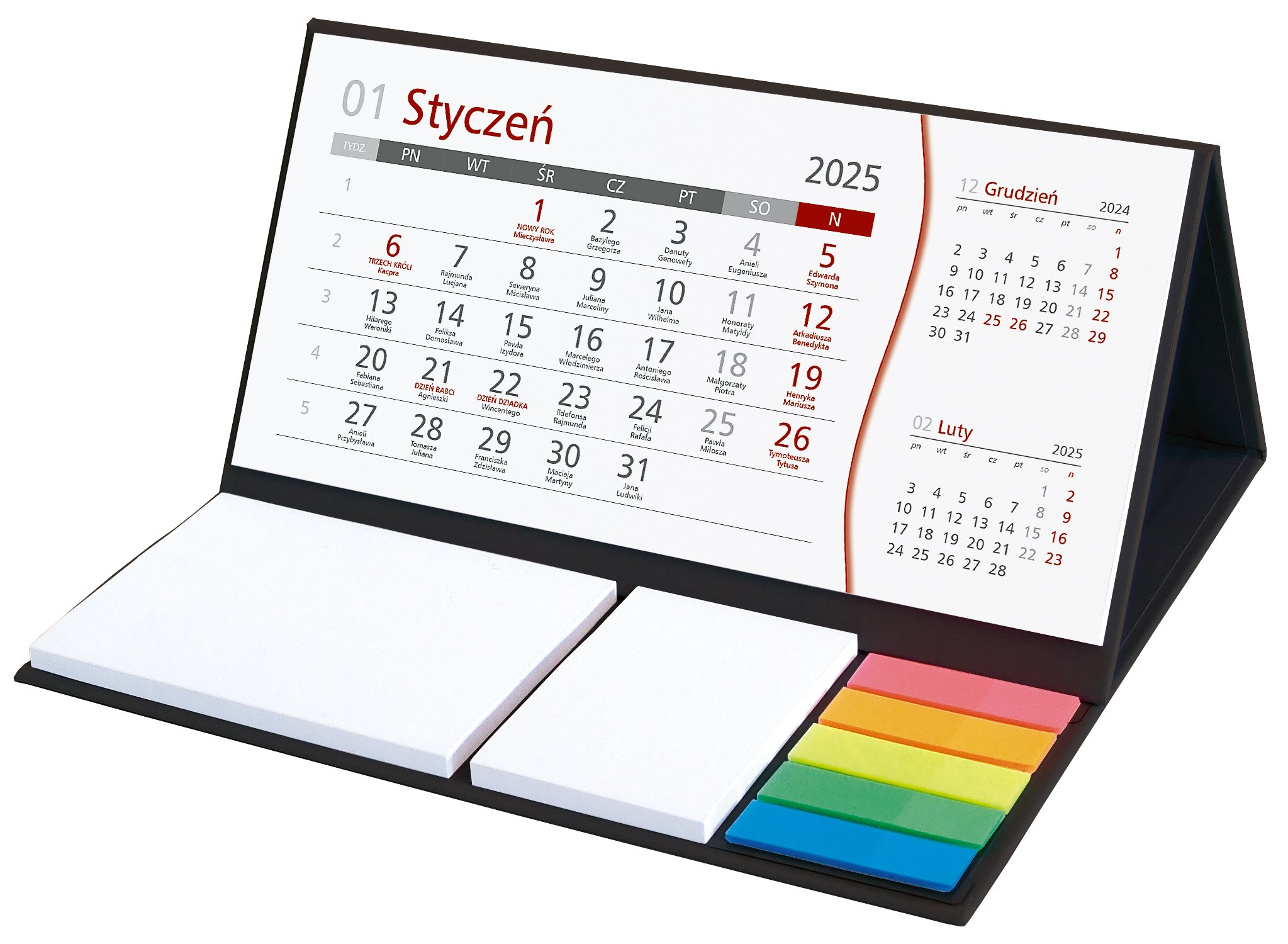 Wygodny kalendarz stojący na biurko z przejrzystym kalendarium w układzie trójdzielnym z poręcznymi karteczkami samoprzylepnymi do notowania. Przydatny zwłaszcza w biurze. W kalendarzu zaznaczono święta i daty imienin. Na tylnej części kalendarza istnieje możliwość wykonania nadruku reklamowego na obszarze o wymiarach 210 x 112 mm.