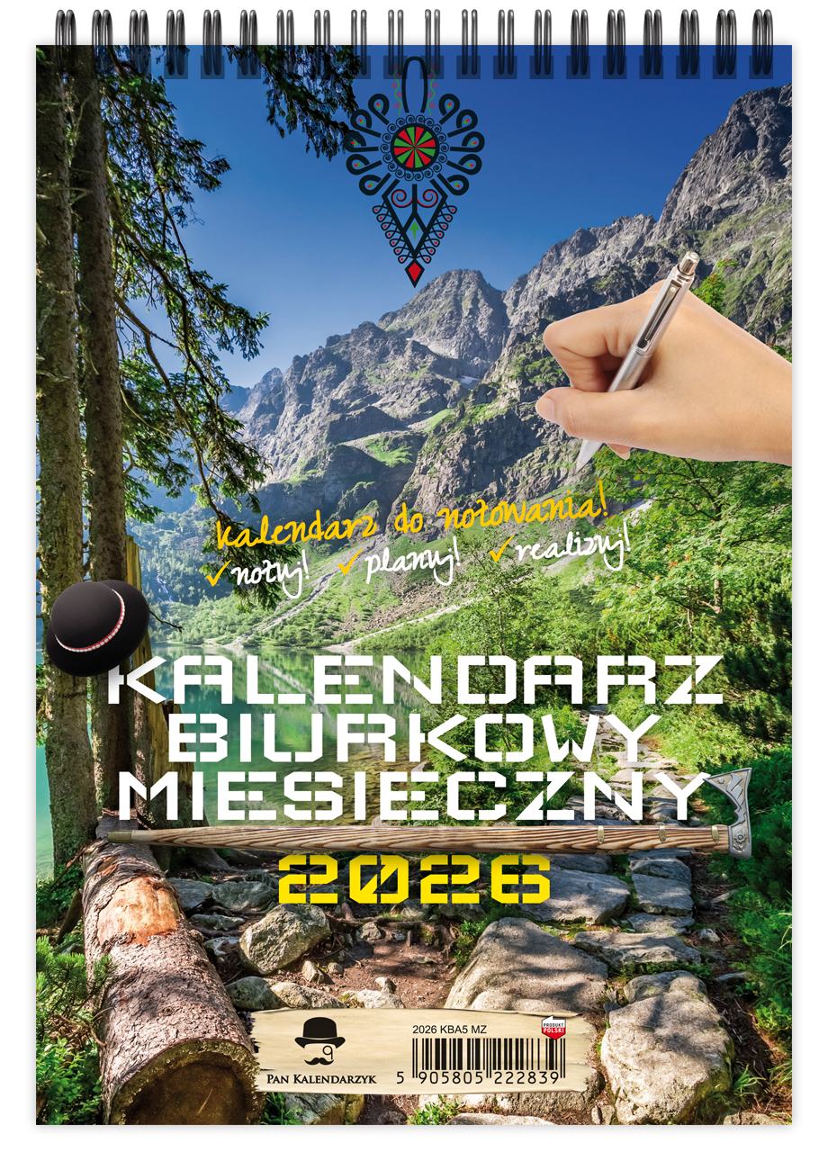 Kalendarz 2026 Biurkowy A5 MIESIĘCZNY PIONOWY. Oprawa spirala na grubej podstawie kartonowej. Format 145/210mm. Papier kredowy. 12 strony (układ miesięczny ) + okładka. Kalendarz zawiera imieniny, nazwy świąt, numeracje tygodni, znaki zodiaku, wschody i zachody słońca. Zdjęcia pięknych widoków górskich