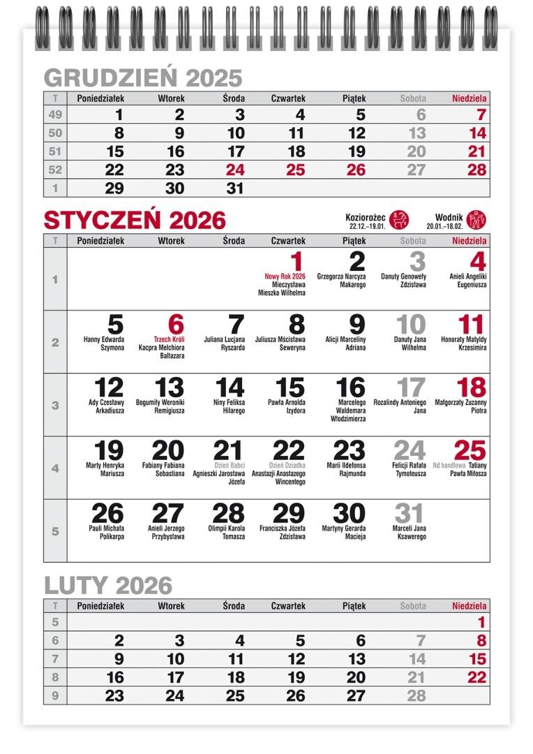 Kalendarz 2026 Biurkowy A5 TRÓJDZIELNY PIONOWY. Oprawa czarna spirala na sztywnej podstawie kartonowej. Format 145/210mm. Papier offsetowy, okładka papier kredowy. 26 strony (dwa układ miesięczne ) + okładka. Układ kalendarium w stylu kalendarza trójdzielnego ( z drugiej strony miejsce na notatki na każdy dzień) Kalendarz zawiera imieniny, nazwy świąt, numeracje tygodni, znaki zodiaku. Kalendaria PL EN DE UE. Mix wzorów .