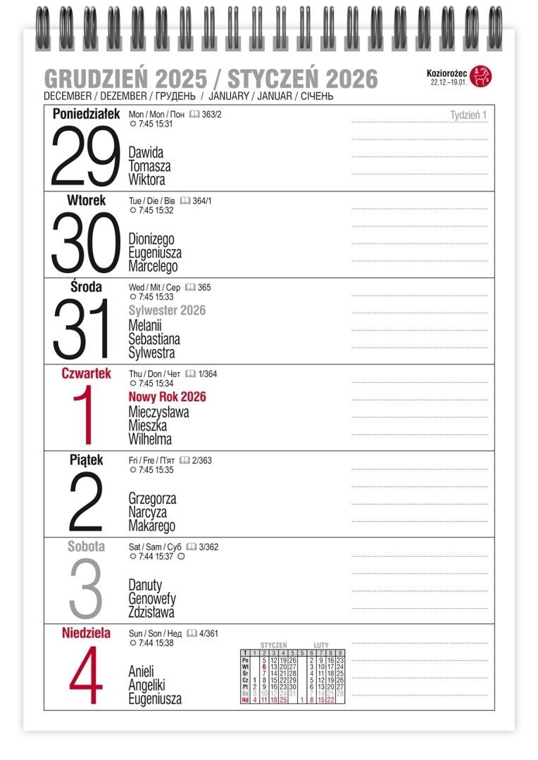 Kalendarz 2026 Biurkowy A5 TYGODNIOWY PIONOWY. Oprawa czarna spirala na sztywnej podstawie kartonowej. Format 145/210mm. Papier offsetowy 80 gsm, okładka papier kredowy. 54 strony (układ tygodniowy ) + okładka. Kalendarz zawiera imieniny, nazwy świąt, numeracje tygodni, znaki zodiaku, wschody i zachody słońca. Dodatkowo nazwy miesiąca i dni tygodnia w języku Angielskim i Niemieckim. Kalendaria PL EN DE UE. Mix wzorów .