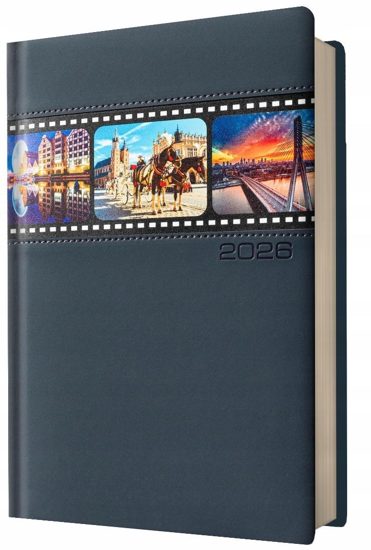 Kalendarz 2026 A5 dzienny granatowy miasta Polski