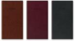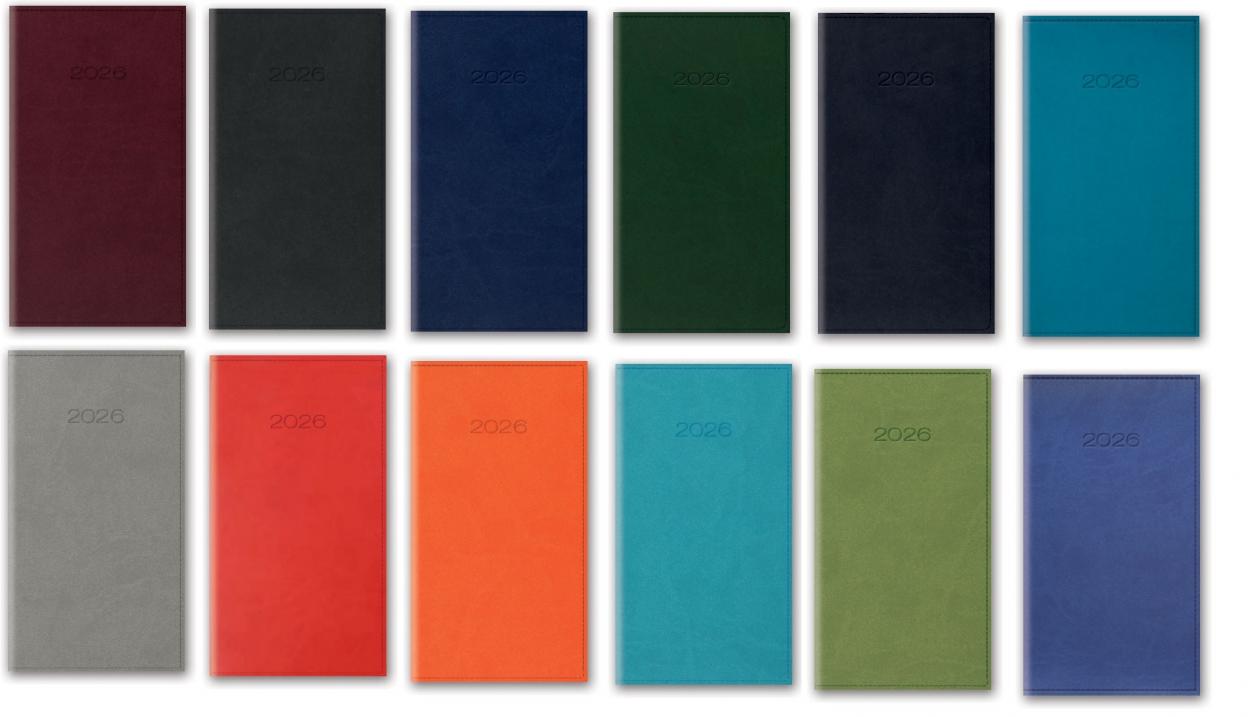 Kalendarz w układzie tygodniowym (tydzień na rozkładówce). Format kieszonkowy A6 (blok: 8,5 x 15,3 cm), papier kremowy, druk szaro-bordowy, registry drukowane. Wstążka-zakładka; 128 stron; notes teleadresowy. Dwa rodzaje okleiny skóropodobnej: gładka lub z tłoczonymi reliefowymi deseniami oraz okleina graficzna (drukowana). Typ okładki: standard bez gąbki.