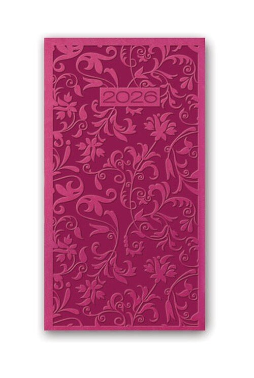 Kalendarz w układzie tygodniowym (tydzień na rozkładówce). Format kieszonkowy A6 (blok: 8,5 x 15,3 cm), papier kremowy, druk szaro-bordowy, registry drukowane. Wstążka-zakładka; 128 stron; notes teleadresowy. Okleina skóropodobna z tłoczonymi reliefowymi deseniami. Typ okładki: standard bez gąbki.