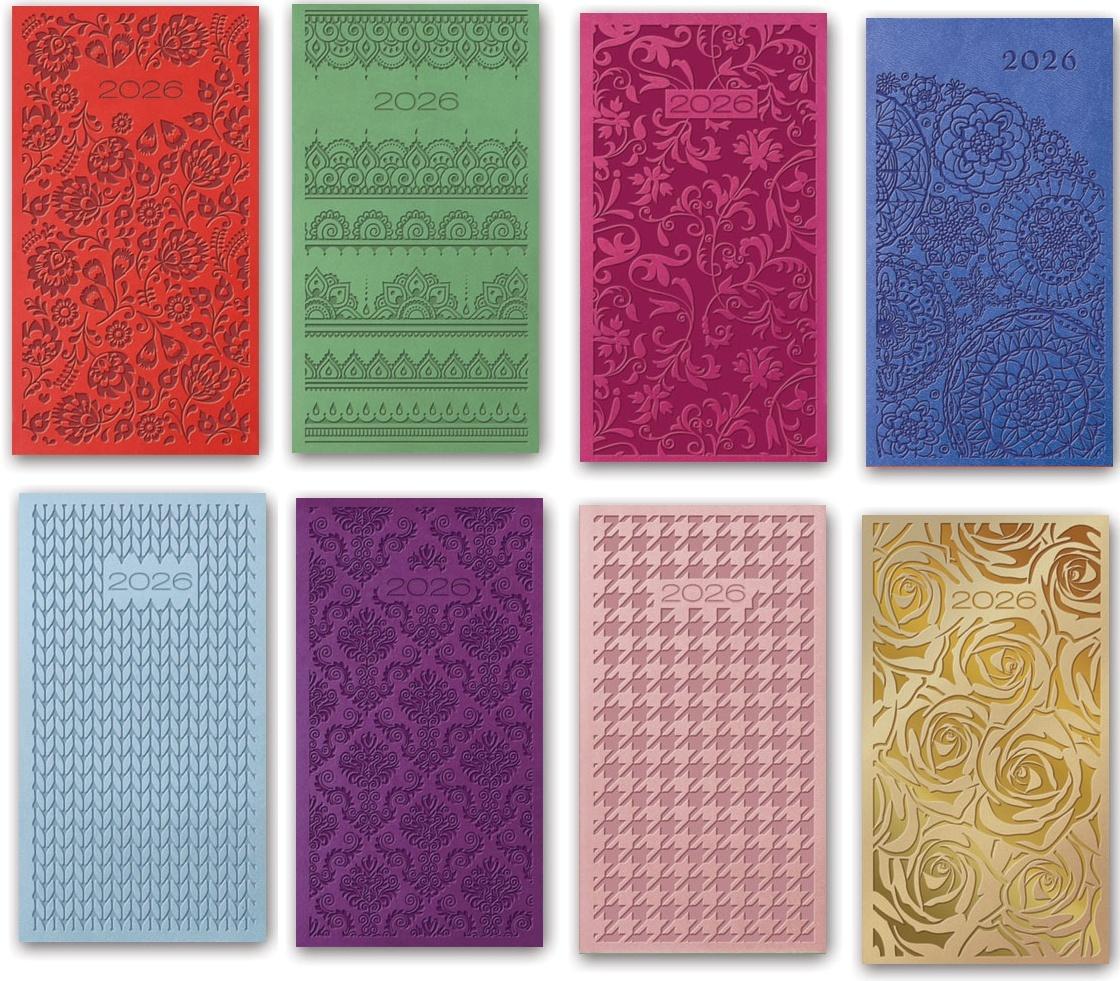 Kalendarz w układzie tygodniowym (tydzień na rozkładówce). Format kieszonkowy A6 (blok: 8,5 x 15,3 cm), papier kremowy, druk szaro-bordowy, registry drukowane. Wstążka-zakładka; 128 stron; notes teleadresowy. Dwa rodzaje okleiny skóropodobnej: gładka lub z tłoczonymi reliefowymi deseniami oraz okleina graficzna (drukowana). Typ okładki: standard bez gąbki.