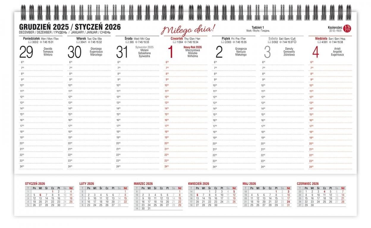 Kalendarz 2026 biurkowy tygodniowy poprzeczny