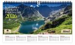 Kalendarz 2026 Biurkowy POPRZECZNY TYGODNIOWY. Oprawa spirala na sztywnej podstawie kartonowej na której znajduje się skrócone kalendarium na 2026 rok. Format 285/135mm. Papier offsetowy 80gsm. Okładka papier kredowy. Kalendarz zawiera imieniny, nazwy świąt, numeracje tygodni, znaki zodiaku, wschody i zachody słońca. 54 strony ( układ tygodniowy ) + okładka. Kalendaria PL EN DE UE. Mix wzorów