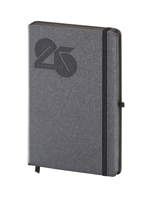 • Kolekcja: Black • Format: A5 • Wymiary okładki: 210x144 mm • Układ: dzień na stronie • Ilość stron: 352 • Oprawa: twarda • Materiał: papier • Gramatura papieru: 80g • Kolor papieru: chamoise • Dodatki: plan roku 2026, ważne wydarzenia, skorowidz adresowy, notatki • Pionowa gumka zamykająca: tak, czarna • Wstążka: tak, czarna • Gumka na długopis: tak • Zaokrąglone rogi: tak • Wyklejka: czarna • Koperta: tak • Barwione brzegi: na czarno