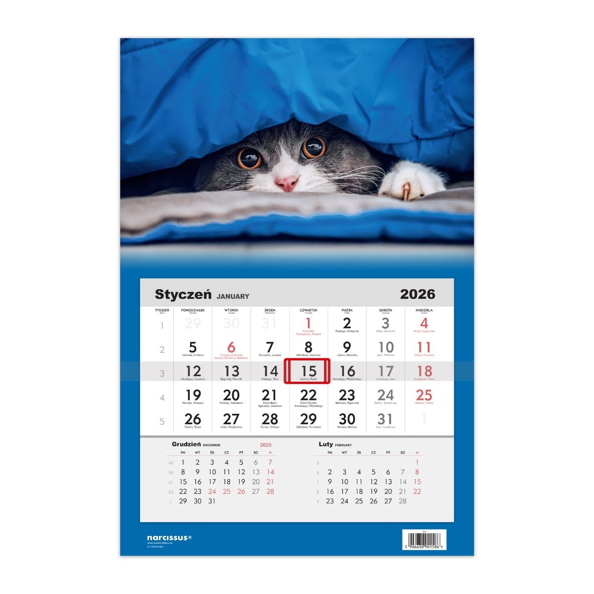 Kalendarz 2026 Jednodzielny Kot Klasyczny kalendarz jednodzielny na 2026 rok, prostokątny, z opaską z przesuwnym okienkiem do zaznaczenia wskazanego dnia. Zawiera duże kalendarium miesięczne z podglądem poprzedniego i kolejnego miesiąca. Kalendarz jest zapakowany w folię ochronną. Sposób zawieszania - otwór w górnej części Wymiary rozłożonego kalendarza to 32 x 48 cm Wyprodukowano w Polsce