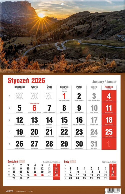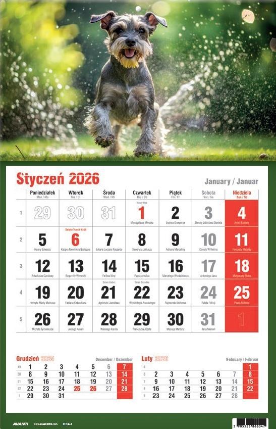 Kalendarz Jednodzielny pasuje wszędzie tam, gdzie na trójdzielny brakuje miejsca, a zależy nam na podglądzie poprzedniego i następnego miesiąca. Kalendaria zawierają oznaczenia miesięcy i dni tygodnia w trzech językach (PL, EN, DE) oraz imieniny i typowe święta. Mix wzorów, wybierane losowo