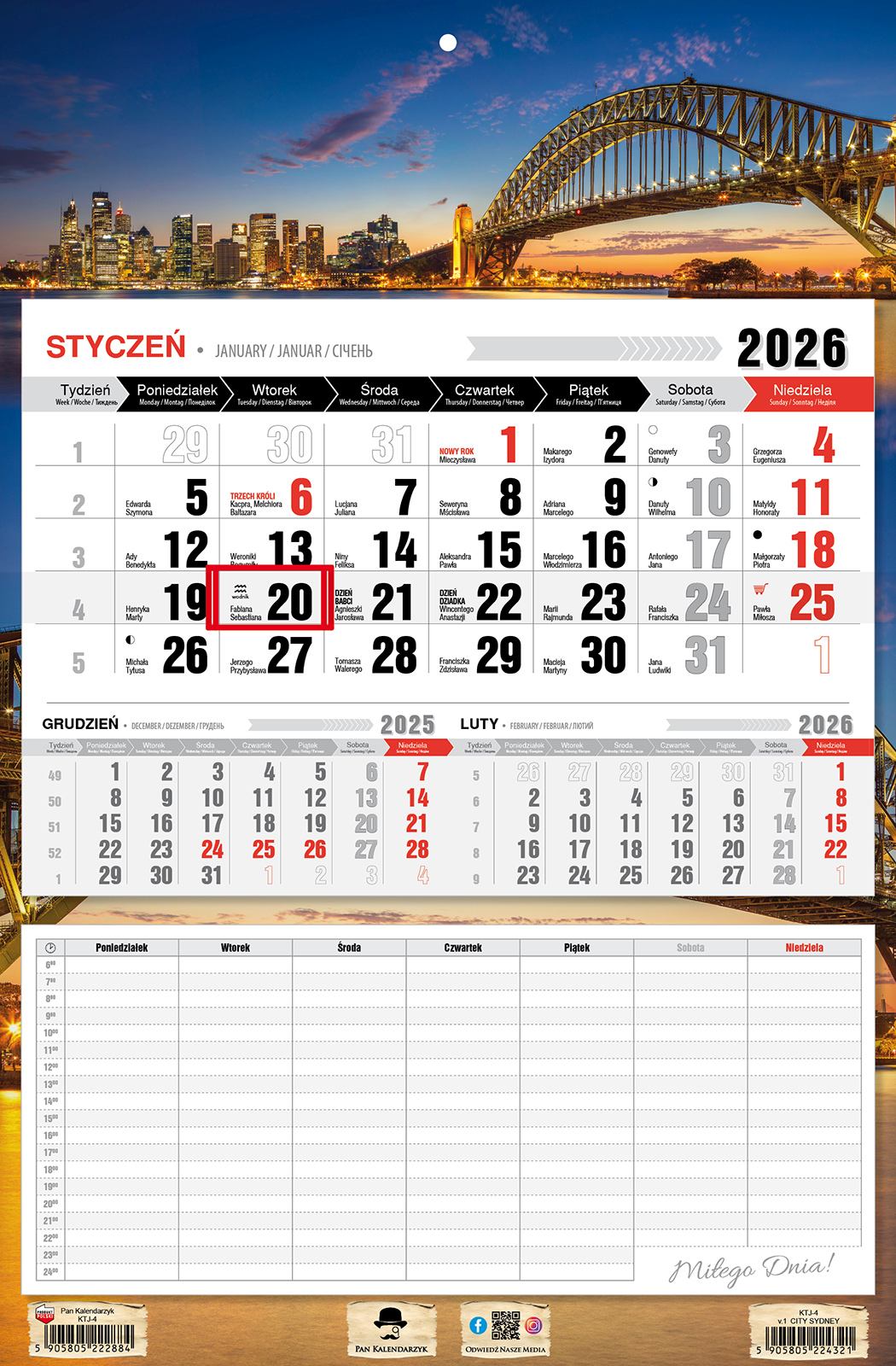 Kalendarz 2026 jednodzielny z planem zajęć Sidney