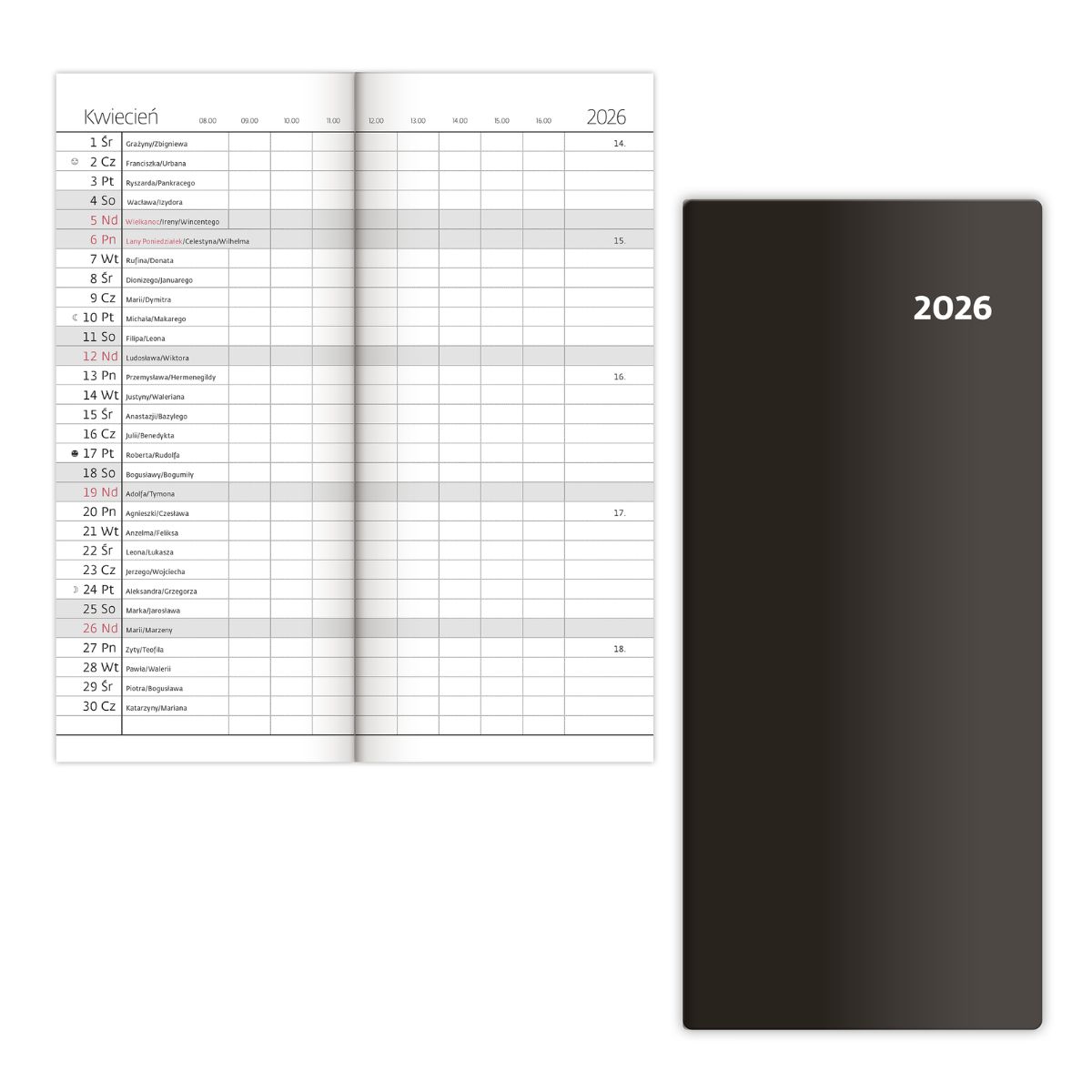 Kalendarz kieszonkowy na 2026 rok z miesięcznym kalendarium, z miejscem na notatki przy każdym dniu. Po otwarciu mamy widok na cały miesiąc - taki układ idealnie sprawdzi się do zapisywania godzin pracy, spotkań, wizyt - niezastąpiony jako podręczny grafik. Wymiary 17,8 x 7,7 cm