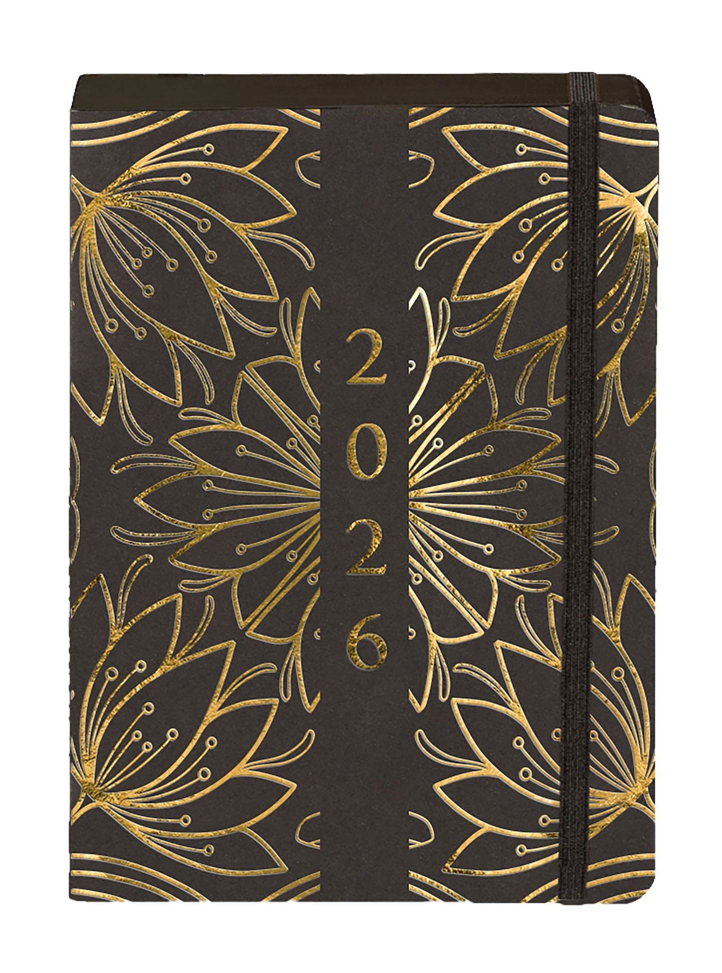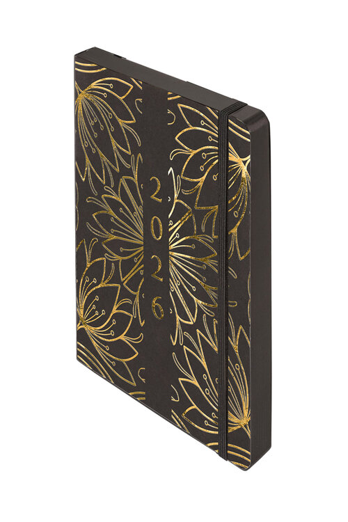 • Kolekcja: Kraft • Format: A5 • Wymiary okładki: 207x141 mm • Układ: dzień na stronie • Ilość stron: 352 • Oprawa: miękka • Materiał: papier • Gramatura papieru: 80g • Kolor papieru: chamoise • Dodatki: plan roku 2026, ważne wydarzenia, skorowidz adresowy, notatki • Pionowa gumka zamykająca: czarna • Wstążka: czarna • Gumka na długopis: nie • Zaokrąglone rogi: tak • Wyklejka: czarna • Koperta: nie • Dostępne kolory: czarny, złoty, kwiaty