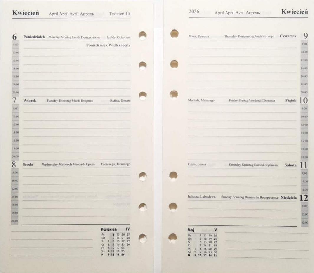 Specyfikacja: Wkład: Rozmiar - 9,5x17,2 cm, Rodzaj wkładu - wymienny, pasujący do rozmiaru okładki, Papier - Chamois wysokiej jakości 70 g/m2, Skład bloku - Kalendarz, Notes, Finanse, Adresy Ilość stron Kalendarza - 162 stron, Układ kalendarza - Tygodniowy, Przekładki - transparentne z polipropylenu, Język kalendarza - Polski, Dodatkowe języki - GB/D/F/RUS, Dodatkowe strony - plan na nowy miesiąc,