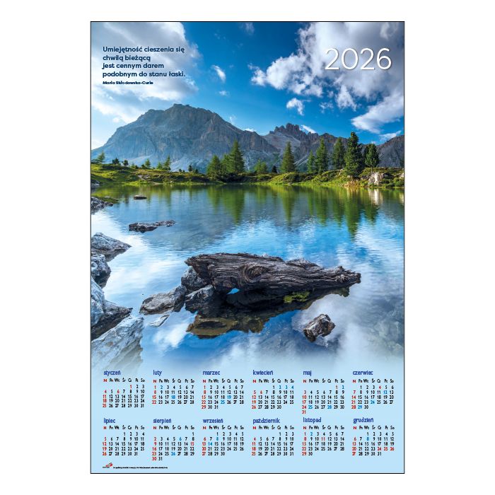 Szukasz kalendarza, którego widok da Ci chwilę wytchnienia? Powieś na ścianie kalendarz plakatowy Góry z pięknym cytatem Umiejętność cieszenia się chwilą bieżącą jest cennym darem podobnym do stanu łaski" autorstwa Marii Skłodowskiej-Curie. To praktyczny i piękny pomocnik na każdy dzień.