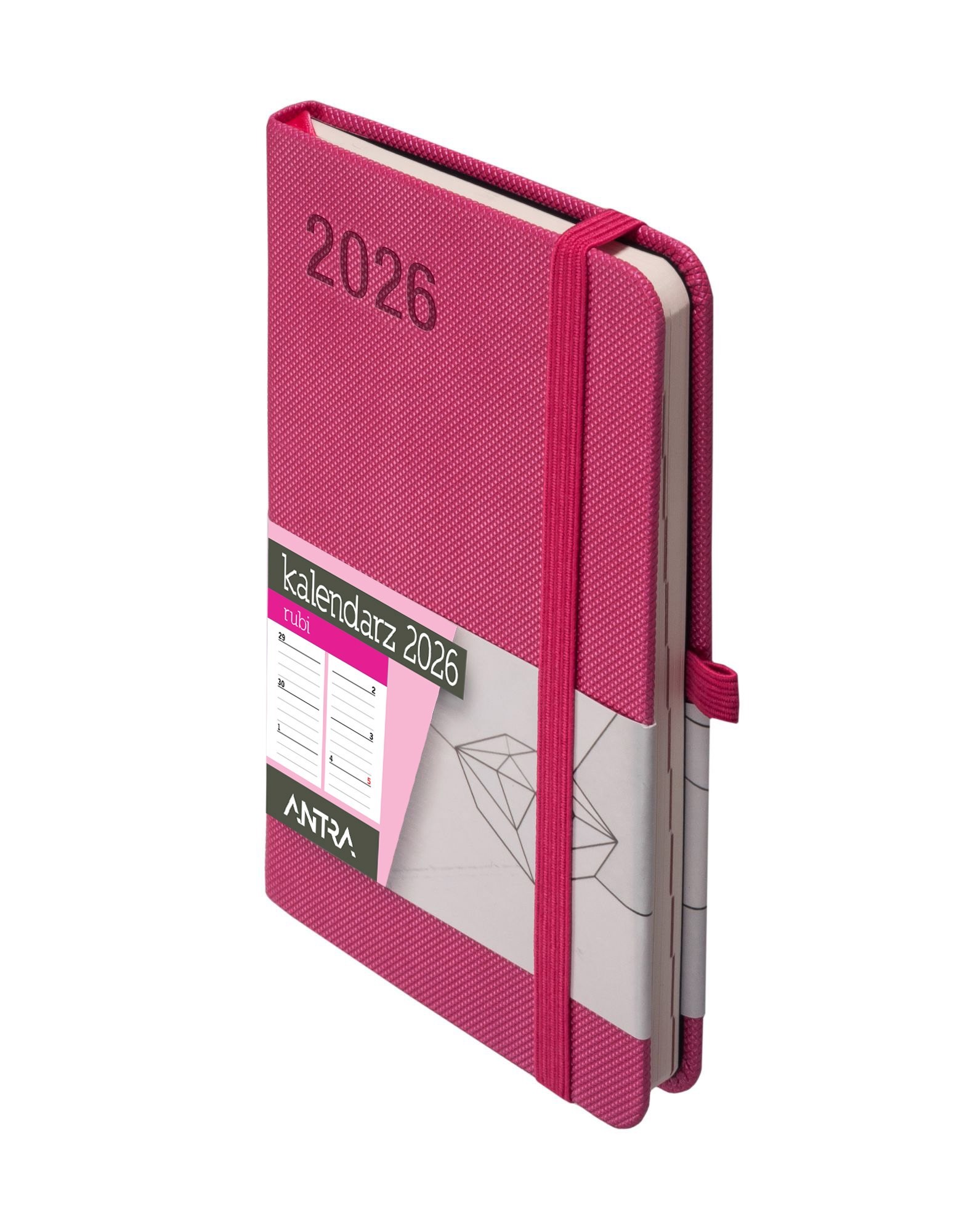 • Kolekcja: Rubi • Format: A6 • Wymiary okładki: 140x90 mm • Układ: tydzień do wglądu • Ilość stron: 144 • Oprawa: twarda • Materiał: skóra ekologiczna, z fakturą • Gramatura papieru: 80g • Kolor papieru: off white • Dodatki: plan roku 2026, ważne wydarzenia, plan miesiąca, skorowidz adresowy, notatki • Pionowa gumka zamykająca: w kolorze okładki • Wstążka: w kolorze okładki • Gumka na długopis: w kolorze okładki • Zaokrąglone rogi: tak • Wyklejka: czarna • Koperta: tak • Dostępne kolory: grafitowy, różowy, czarny, zielony