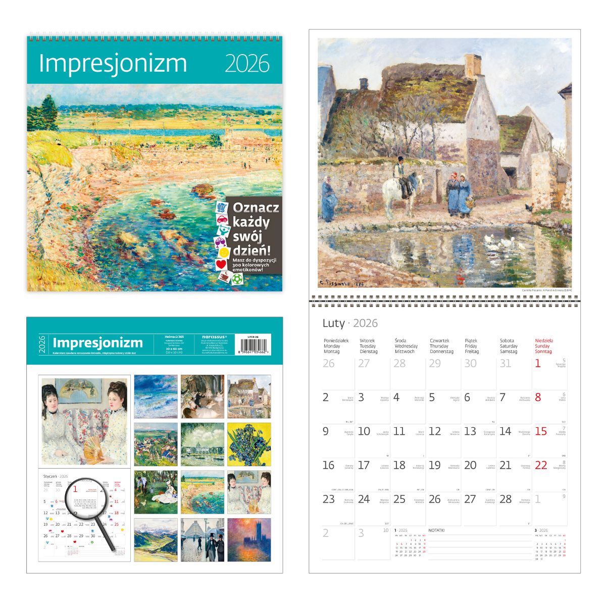 Kalendarz 2026 Impresjonizm 30x30 z naklejkami Kalendarz ścienny miesięczny z dwunastoma zdjęciami - po jednym na każdy miesiąc. Duże kalendarium w języku polskim posiada oznaczenia świąt oraz imienin. Każde pole zawiera wystarczająco dużo miejsca na umieszczenie krótkiej notatki oraz oznaczenie dnia jedną z 300 naklejek z zestawu dołączonego na końcu kalendarza. Kolekcja naklejek obejmuje graficzne oznaczenia takich wydarzeń jak imieniny, urodziny, randka, wakacje, zakupy, wizyta u dentysty czy lekarza, mecz, siłownia, praca, impreza, teatr, muzyka, pies, kot. Wymiary: 30x30 cm, po rozłożeniu 30x60 cm Sposób zawieszania - otwór w górnej części