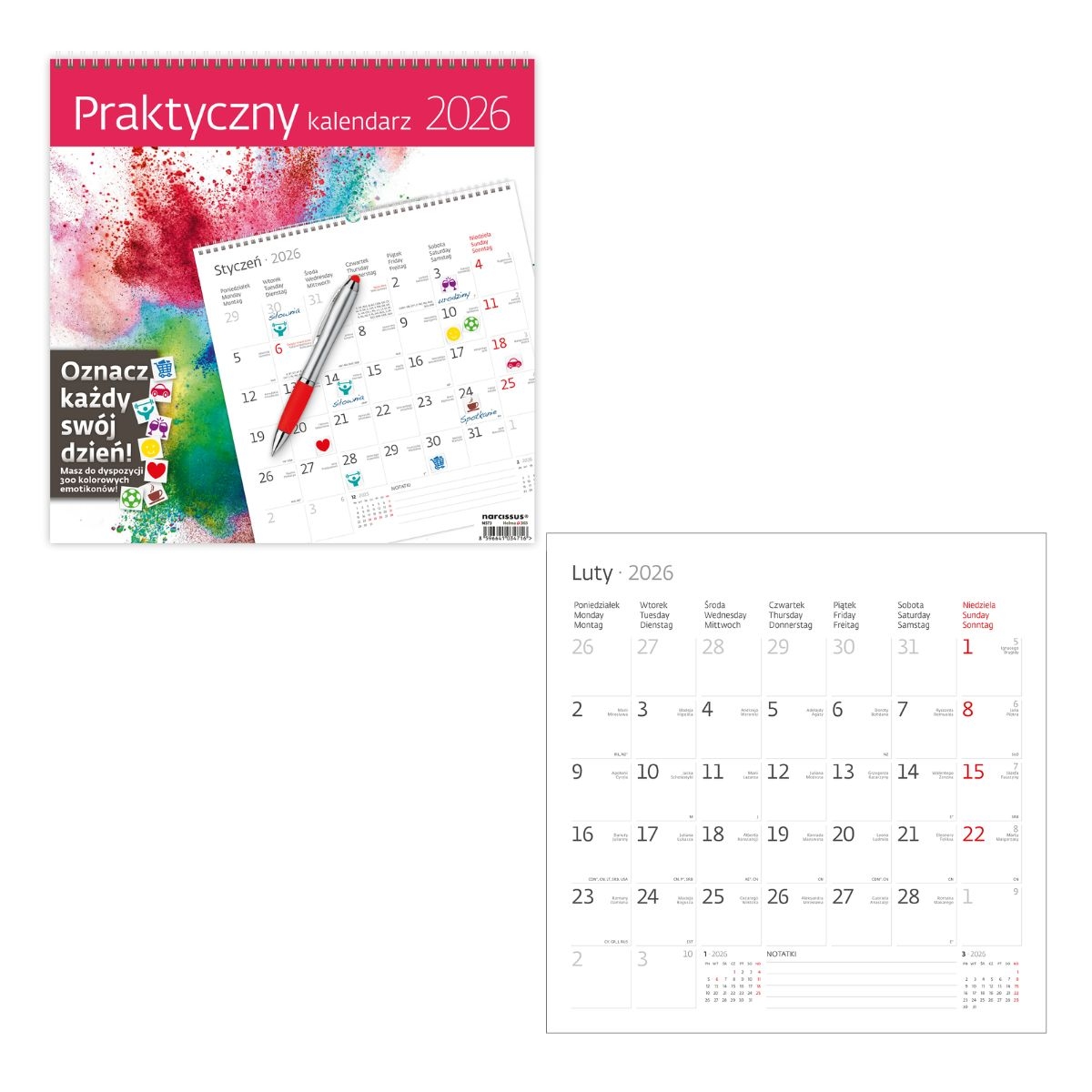 Kalendarz 2026 Praktyczny 30x30 z naklejkami Kalendarz ścienny z naklejkami ułatwiającymi organizację zajęć i planów. Naklejek jest aż 300 i są one na ostatniej, dodatkowej karcie kalendarza. Tematów oznaczeń jest bardzo dużo: imieniny, urodziny, randka, wakacje, zakupy, dentysta, lekarz, piłka nożna, siłownia, praca, impreza, teatr, muzyka, pies, kot. Kalendarz zawiera 12 plansz z dużym kalendarium z oznaczeniami świąt oraz imieninami. Wymiary: 30x30 cm, po rozłożeniu 30x30 cm Sposób zawieszania - otwór w górnej części