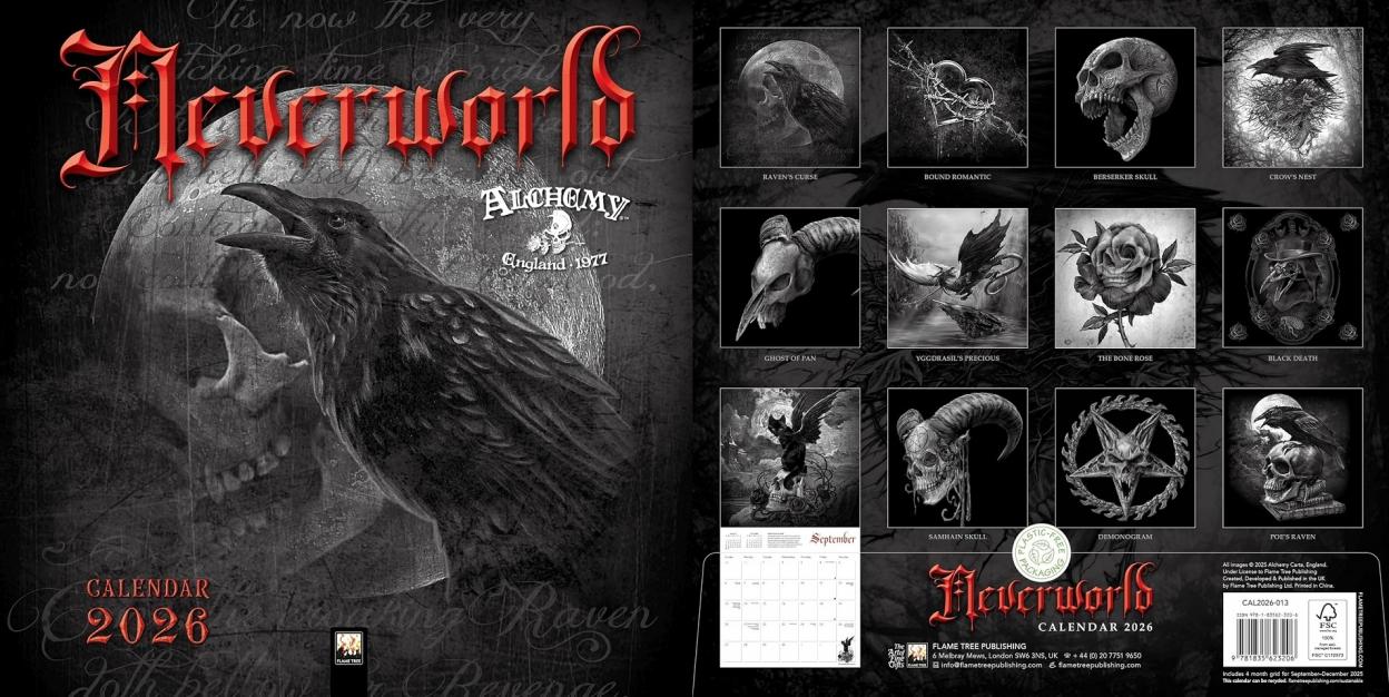 Kalendarz ścienny o wymiarach 300 300 mm, wydany przez Flame Tree Publishing pod tytułem Alchemy: Neverworld Wall Calendar 2026 (Art Calendar). Motywem przewodnim są mroczne, pełne atmosfery ilustracje z katalogu Alchemy England obrazy przywołujące klimat gotyckiej literatury, tajemnicy i subtelnego piękna w ciemniejszych tonacjach. Każdy miesiąc zdobi jedna ze 12 imponujących grafik, które łączą w sobie dramatyzm, nastrojowość i artystyczną głębię.