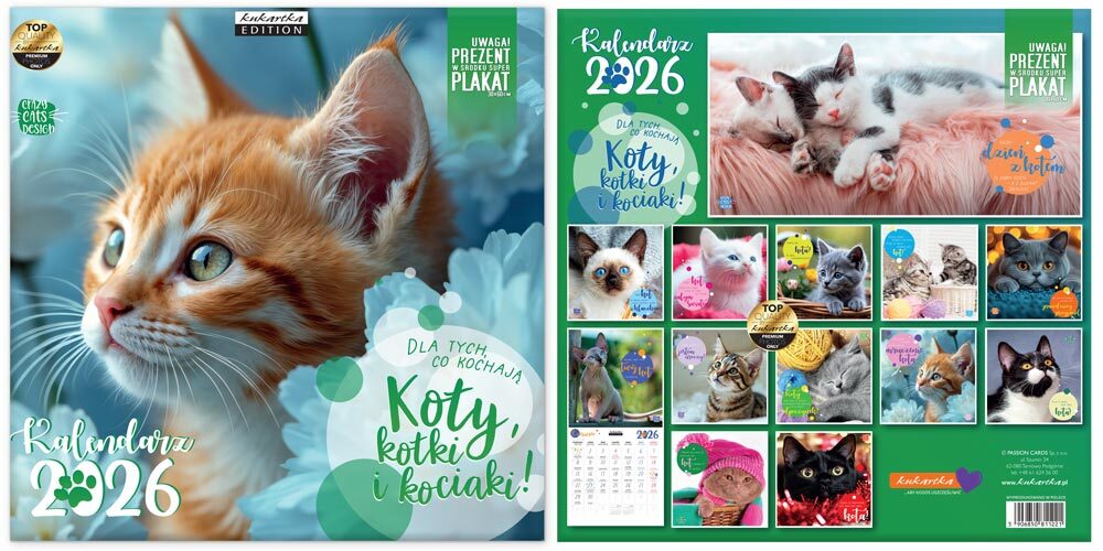 Kalendarz 2026 Koty, kotki i kociaki Kwadratowy kalendarz ścienny na rok 2026 z serii "Koty, kotki i kociaki". Każdy miesiąc przyozdabia zdjęcie kociaka, który będzie wspaniałą ozdobą Waszego domu. Taki kalendarz to idelany prezent dla miłośników kotów. Kalendarz po rozłożeniu ma wymiary 30x60 cm - górny kwadrat wypełnia zdjęcie, a dolny kalendarium. PREZENT: na środku kalendarza znajdziecie plakat ze zdjęciem kociaka o wymiarach 30x 60 cm Specyfikacja: Wielkość: 30 x 30 cm (po rozłożeniu 30 x 60 cm) Gratis: plakat Styl: cytaty, nowoczesny, klasyczny, zdjęciowy