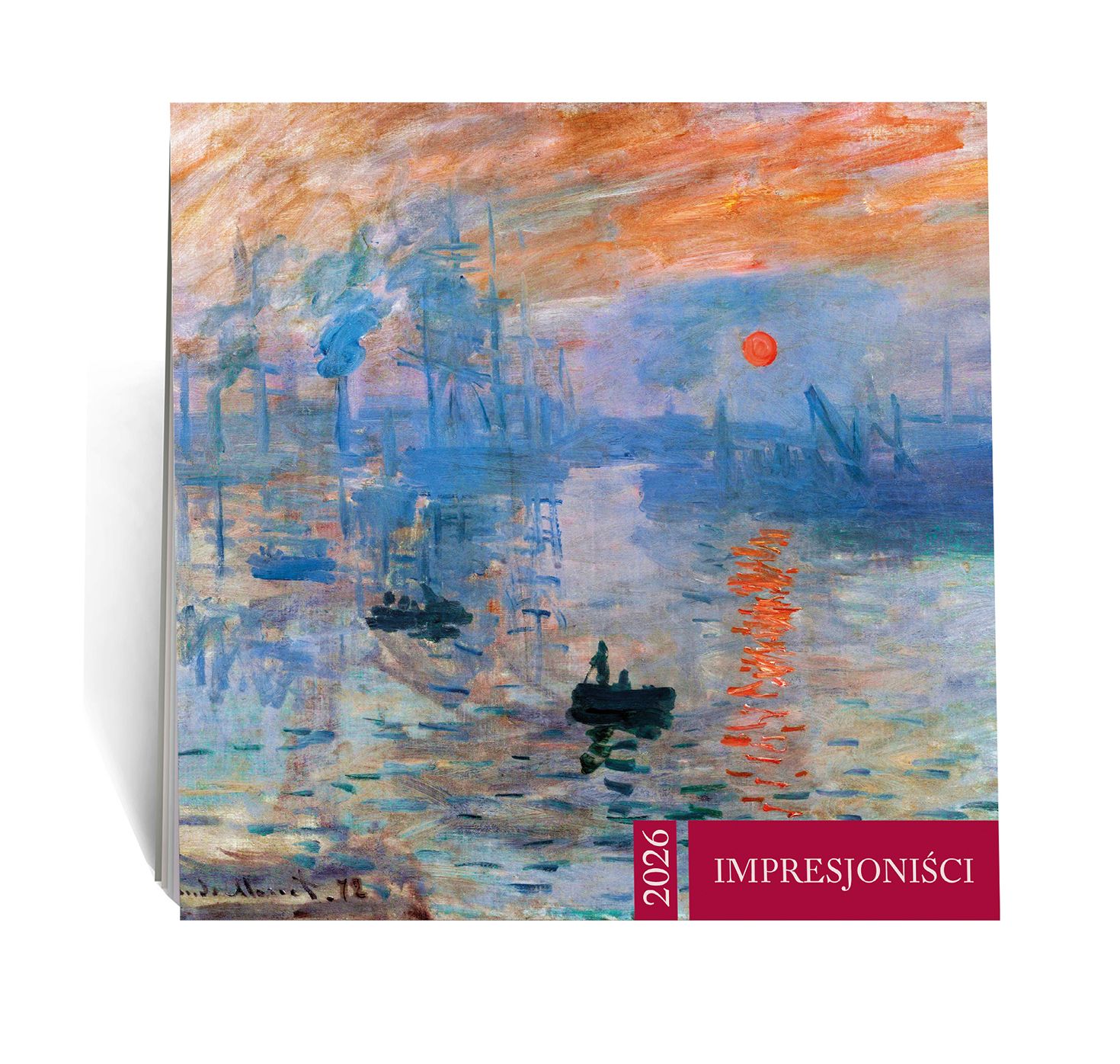 12 arcydzieł impresjonistów - każdy miesiąc prezentuje słynne obrazy mistrzów, w tym dzieła Claude'a Moneta jak kultowe Impression, Sunrise (Wschód słońca)