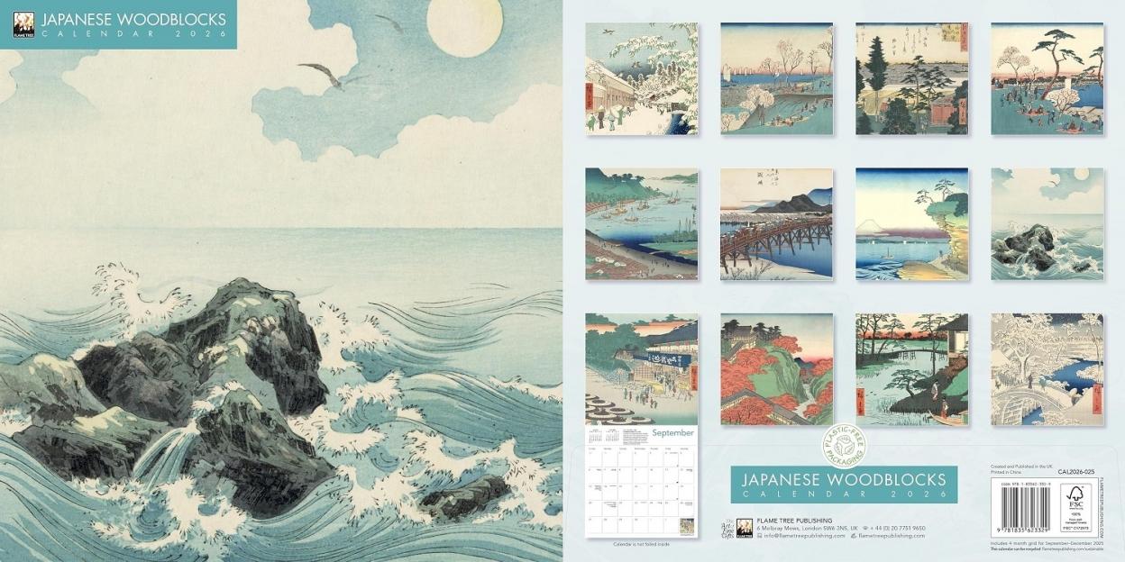 Kalendarz ścienny o wymiarach 300 300 mm, zatytułowany Japanese Woodblocks Wall Calendar 2026 (Art Calendar), wydany przez Flame Tree Publishing. Motywem przewodnim są klasyczne japońskie drzeworyty, w tym dzieła takich mistrzów jak Utagawa Hiroshige I i II. Każda z 12 stron prezentuje jedno z wybranych dzieł, pełnych malowniczych pejzaży, gór, rzek i scen codziennego życia, a poniżej znajduje się krótki tekst wyjaśniający kontekst artystyczny pracy.