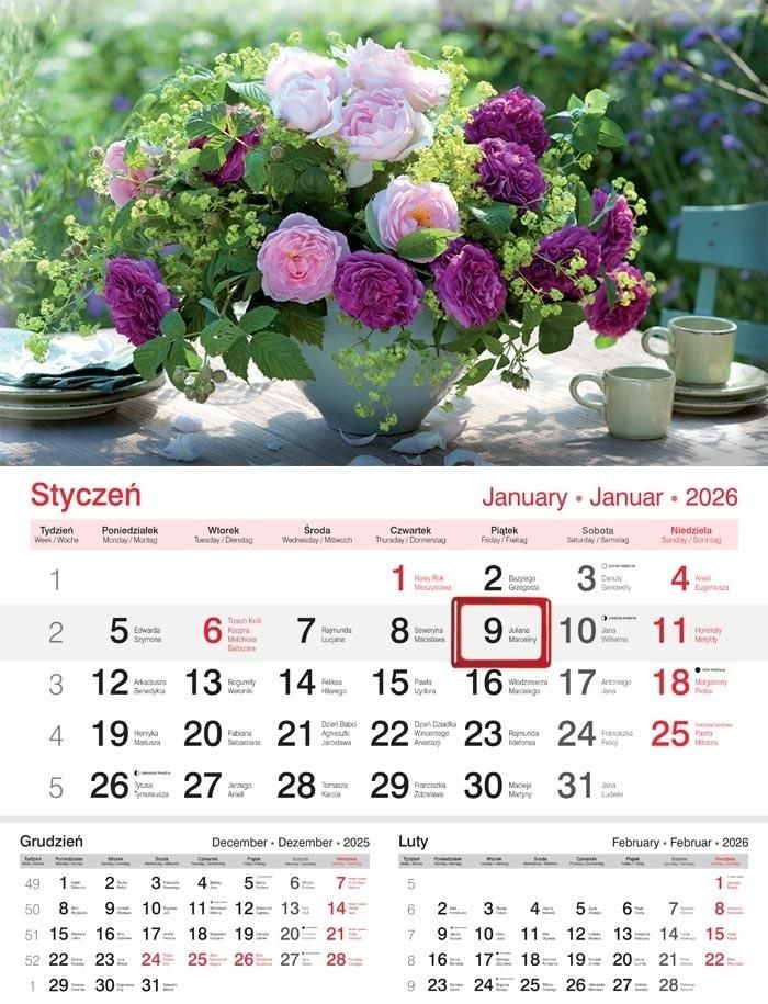 druk: zdjęcie jednostronny barwny + folia błysk; kalendarium jednostronny, barwny;