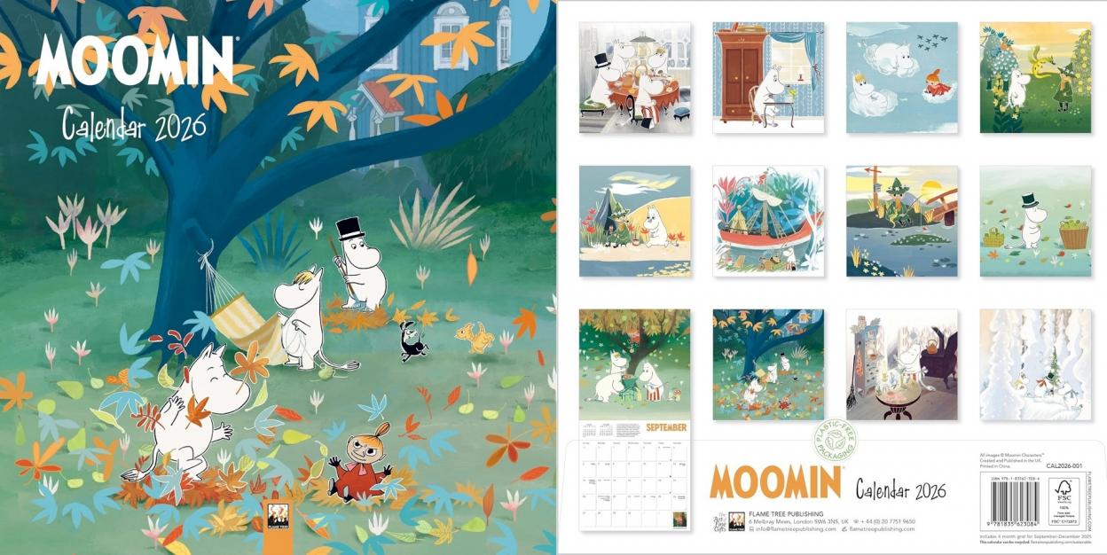 Kalendarz ścienny o wymiarach 300 300 mm, zatytułowany Muminki Moomin Wall Calendar 2026 (Art Calendar), wydany przez Flame Tree Publishing. Motywem przewodnim są klasyczne, pełne wdzięku ilustracje Tove Jansson, które przenoszą do urokliwej Doliny Muminków świata pełnego ciepła, humoru i lekko melancholijnej, skandynawskiej atmosfery.