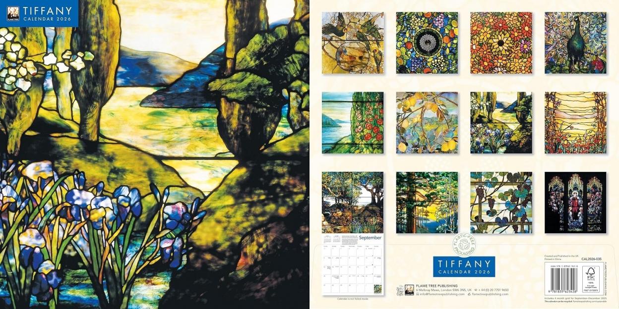 Kalendarz ścienny o wymiarach 300 300 mm, zatytułowany Tiffany Wall Calendar 2026 (Art Calendar), wydany przez Flame Tree Publishing. Motywem przewodnim są witraże i projekty szkła artystycznego autorstwa Louisa Comforta Tiffany'ego - amerykańskiego artysty związanego z ruchem Arts & Crafts oraz secesją. Każda z 12 stron prezentuje jedno z jego niezwykłych dzieł, pełnych barw, światła i misternych detali, a poniżej zamieszczono krótki opis przybliżający kontekst artystyczny pracy.