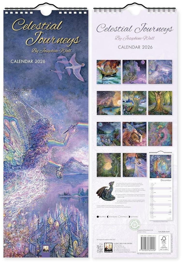 Kalendarz ścienny o wymiarach 420 145 mm, zatytułowany Heavenly Journeys Slim Calendar 2026 (Art Calendar), wydany przez Flame Tree Publishing. Motywem przewodnim są pełne spokoju i mistycyzmu ilustracje przedstawiające niebiańskie krajobrazy, anioły, eteryczne postacie i sceny, które przenoszą w świat duchowej refleksji i wyciszenia.