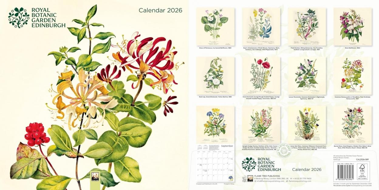 Kalendarz ścienny o wymiarach 300 300 mm, zatytułowany Royal Botanic Garden Edinburgh Wall Calendar 2026 (Art Calendar), wydany przez Flame Tree Publishing. Motywem przewodnim są delikatne i precyzyjne ilustracje roślin autorstwa Charlotte Cowan Pearson, które przenoszą do świata botanicznego piękna, pełnego detali i naturalnej harmonii.