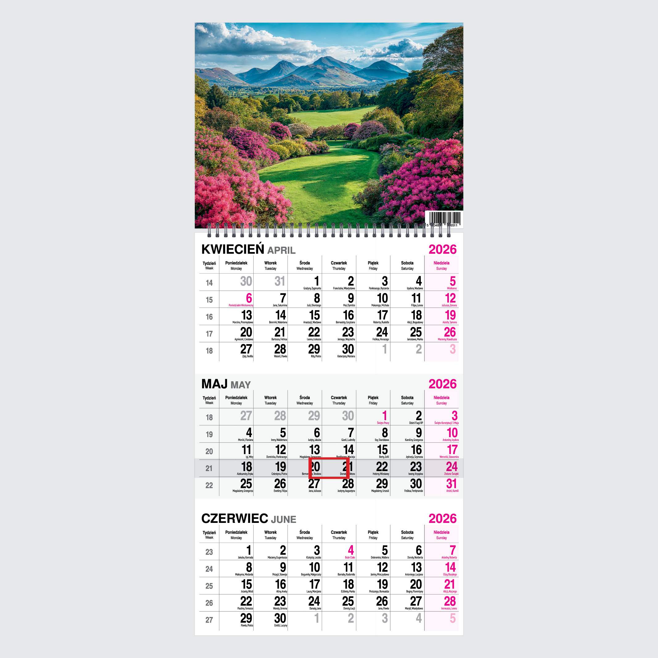 - Zawiera czytelne kalendarium z imieninami i świętami w języku polskim