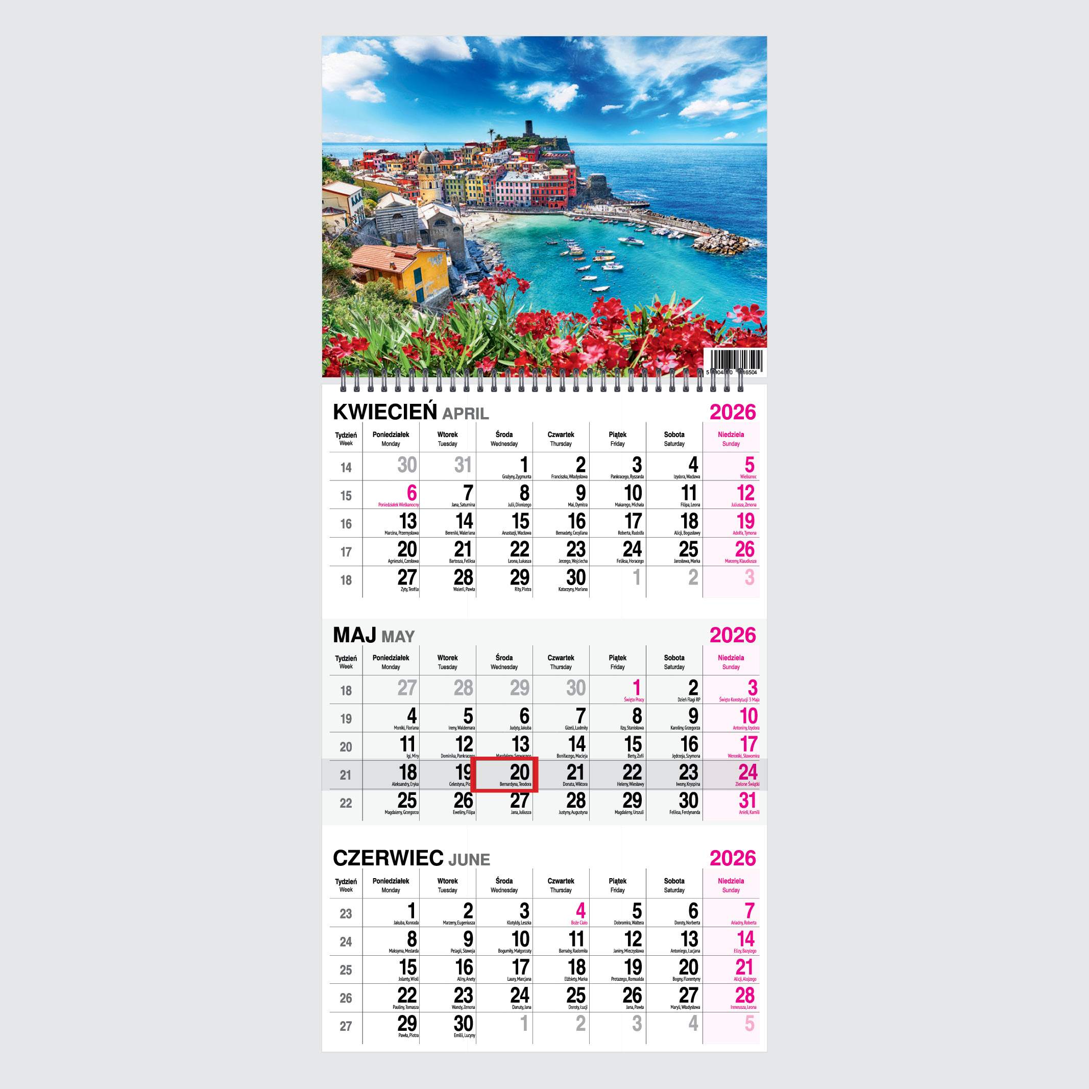 - Zawiera czytelne kalendarium z imieninami i świętami w języku polskim