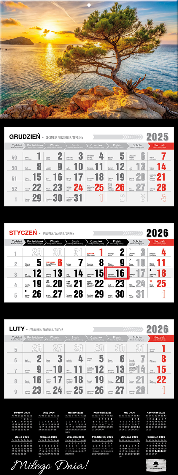 Kalendarz 2026 trójdzielny premium zachód słońca
