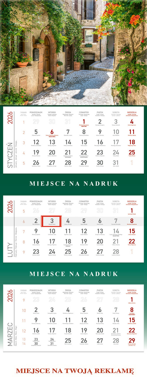 Kalendarz wiszący ścienny z kalendarium w układzie trójdzielnym z ozdobną główka, wypukłą i lakierowaną. Kalendarz składany do formatu A4.