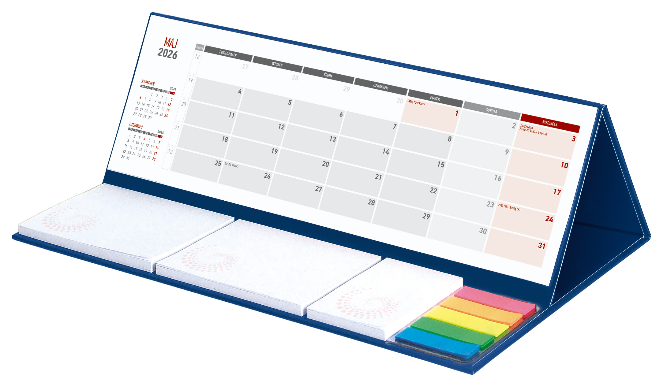 • nr katalogowy: KB062B • układ: miesięczny • format kalendarium: 309 x 99 mm • druk: 2+0 • format kalendarza: 315 x 192 x 112 mm • foliowany pojedynczo Wygodny kalendarz stojący na biurko z przejrzystym kalendarium w układzie miesięcznym z poręcznymi karteczkami samoprzylepnymi do notowania. Przydatny zwłaszcza w biurze. W kalendarzu zaznaczono święta. Na tylnej części kalendarza istnieje możliwość wykonania nadruku reklamowego na obszarze o wymiarach 305 x 100 mm. Część informacyjna kalendarza zawiera: • Kalendarium 2026 • Miesiąc bieżący, poprzedni i następny • Daty świąt • Samoprzylepne kartki do notowania • Kolorowe znaczniki