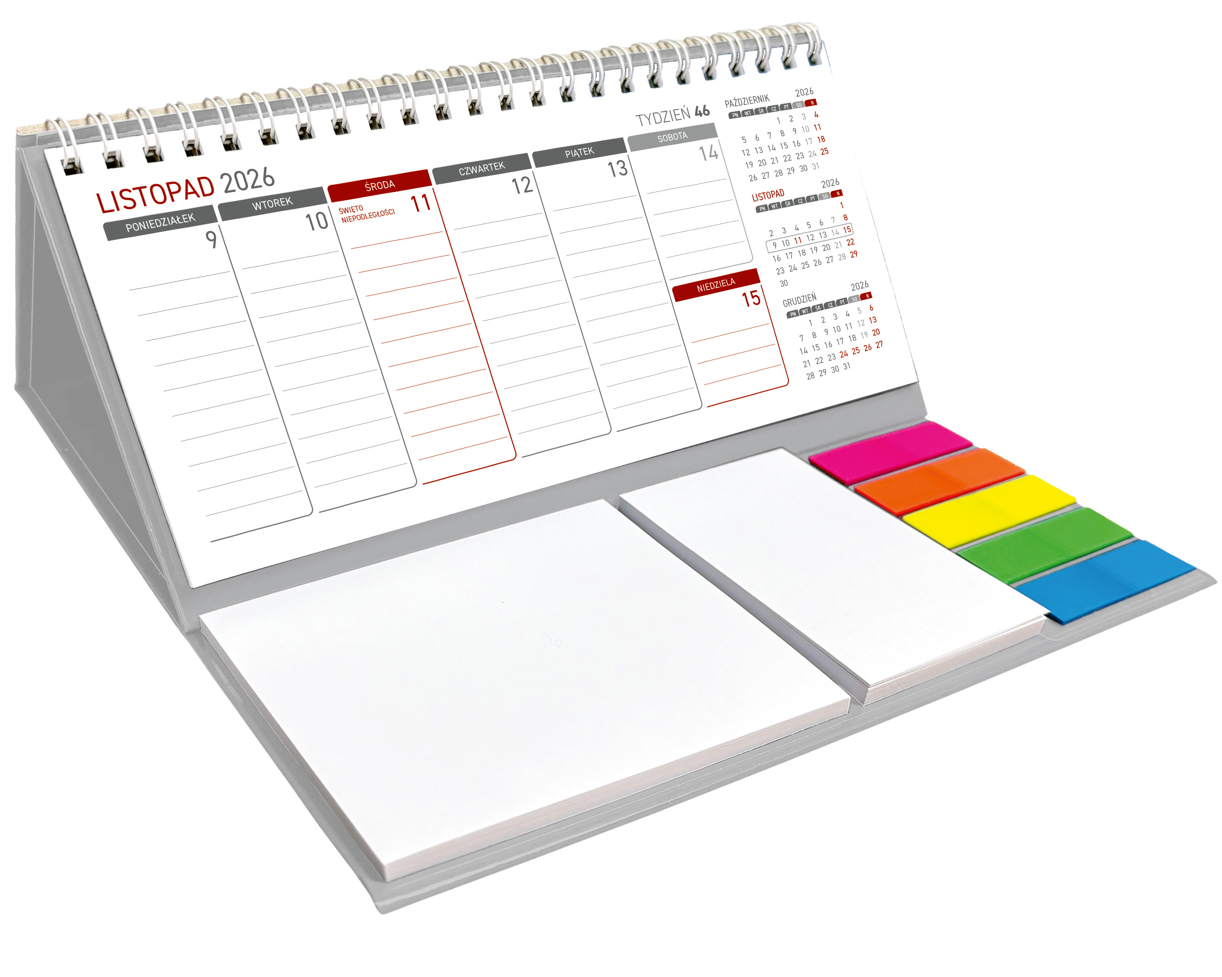 • nr katalogowy: KB044B • układ: tygodniowy • format kalendarium: 204 x 99 mm • druk: 2+0 • format kalendarza: 210 x 192 x 112 mm • foliowany pojedynczo Wygodny kalendarz stojący na biurko z przejrzystym kalendarium w układzie tygodniowym z poręcznymi karteczkami samoprzylepnymi do notowania. Przydatny zwłaszcza w biurze. W kalendarzu zaznaczono święta. Część informacyjna kalendarza zawiera: • Kalendarium 2026 • Miesiąc bieżący, poprzedni i następny • Daty świąt • Samoprzylepne kartki do notowania • Kolorowe znaczniki