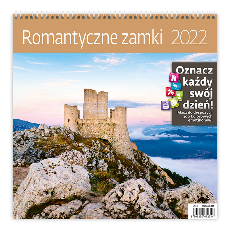 Kalendarz ścienny na 2022 rok, z naklejkami ułatwiającymi organizację zajęć i planów. Naklejek jest aż 300 i są one na ostatniej, dodatkowej karcie kalendarza. Tematów oznaczeń jest bardzo dużo: imieniny, urodziny, randka, wakacje, zakupy, dentysta, lekarz, piłka nożna, siłownia, praca, impreza, teatr, muzyka, pies, kot. Kalendarz zawiera 12 plansz ze zdjęciami zamków oraz dużym kalendarium z oznaczeniami świąt oraz imieninami. Wymiary: 30x30 cm, po rozłożeniu 30x60 cm.