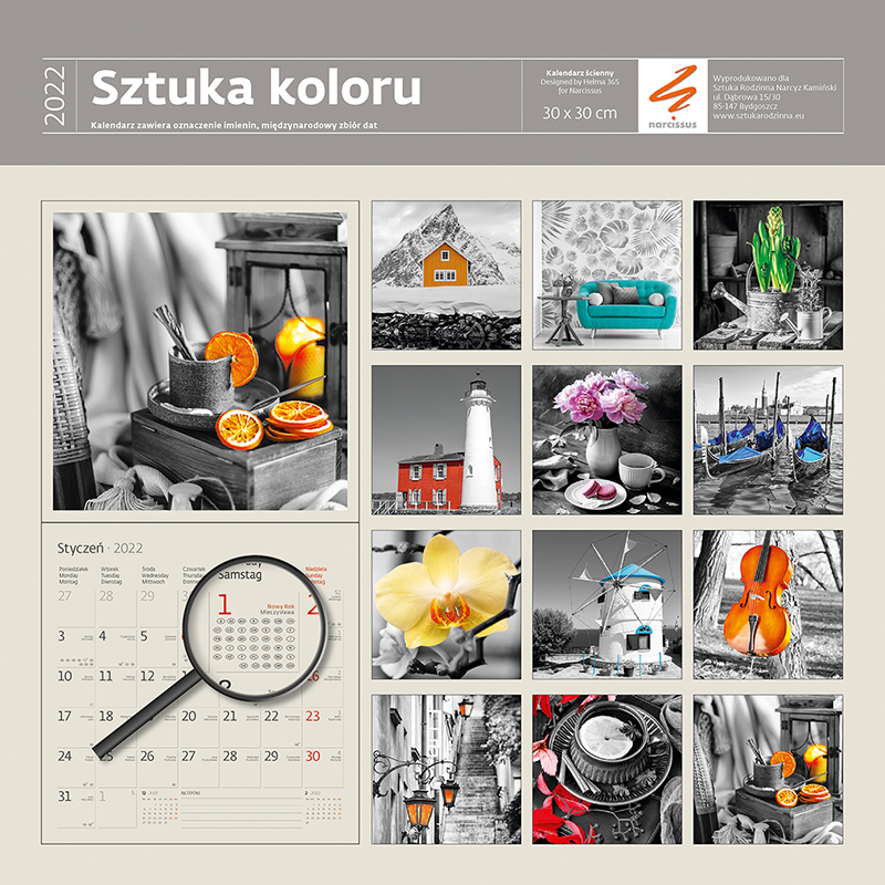 Kalendarz ścienny na 2022 rok, z naklejkami ułatwiającymi organizację zajęć i planów. Naklejek jest aż 300 i są one na ostatniej, dodatkowej karcie kalendarza. Tematów oznaczeń jest bardzo dużo: imieniny, urodziny, randka, wakacje, zakupy, dentysta, lekarz, piłka nożna, siłownia, praca, impreza, teatr, muzyka, pies, kot. Kalendarz zawiera 12 plansz z czarno-białymi zdjęciami i zaznaczonym 1 kolorem oraz dużym kalendarium z oznaczeniami świąt oraz imieninami. Wymiary: 30x30 cm, po rozłożeniu 30x60 cm.