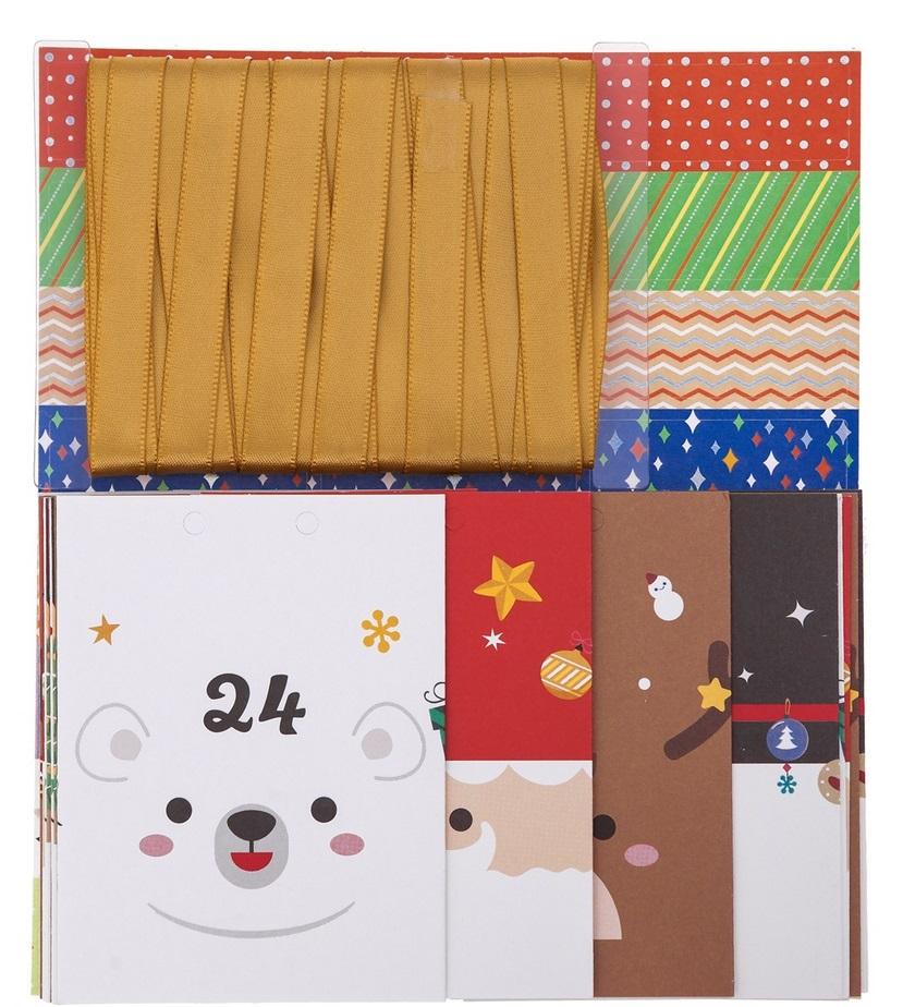 W zestawie znajdziesz 24 pudełeczka z uroczymi wzorami Mikołajów, reniferów, bałwanków i misiów polarnych, ozdobne naklejki w różnych kolorach, służące do zamknięcia opakowań oraz złota wstążeczka do wykonania zawieszek. Możesz też przeciągnąć całą wstążeczkę przez wszystkie pudełeczka i stworzyć z nich duży, wiszący kalendarz.