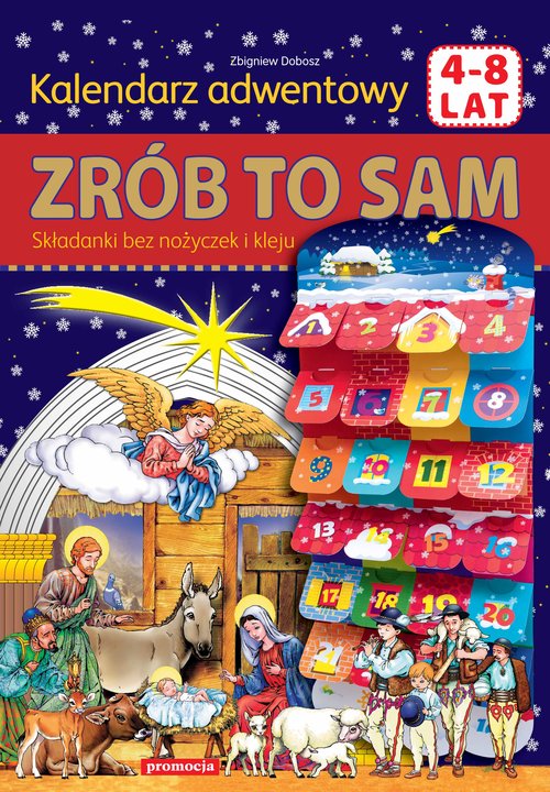 Kalendarz adwentowy to jedna z najpiękniejszych tradycji bożonarodzeniowych. Czekając na Boże Narodzenie, dzieci każdego dnia odkrywają nowy obrazek i nowe przesłanie religijne, które zachęca je do robienia dobrych uczynków. Dzięki tej interaktywnej książeczce dzieci od 4. roku życia mogą samodzielnie złożyć kalendarz adwentowy ze wstępnie wyciętych elementów z kartonu. Nie potrzebują do tego ani nożyczek, ani kleju. Zamieszczone wskazówki i przykłady oraz narysowane linie zgięcia pozwalają dzieciom samodzielnie składać i łączyć ze sobą elementy kalendarza i okienek z przesłaniami. Seria „Zrób to sam” proponuje dzieciom twórczą i rozwijającą zabawę w domu i w przedszkolu. Konstruując łatwe do wykonania modele, dzieci tworzą fascynujący świat, a przy tym ćwiczą sprawność manualną i kształcą wyobraźnię przestrzenną. Dziecko może całkowicie samodzielnie wykonać zawarte w książkach z tej serii modele – bez kleju i bez nożyczek! Pomogą wzory, jasne instrukcje oraz nacięcia. Dodatkową atrakcją składanek są proste teksty, które podpowiedzą, jak ożywić kartonowe modele.