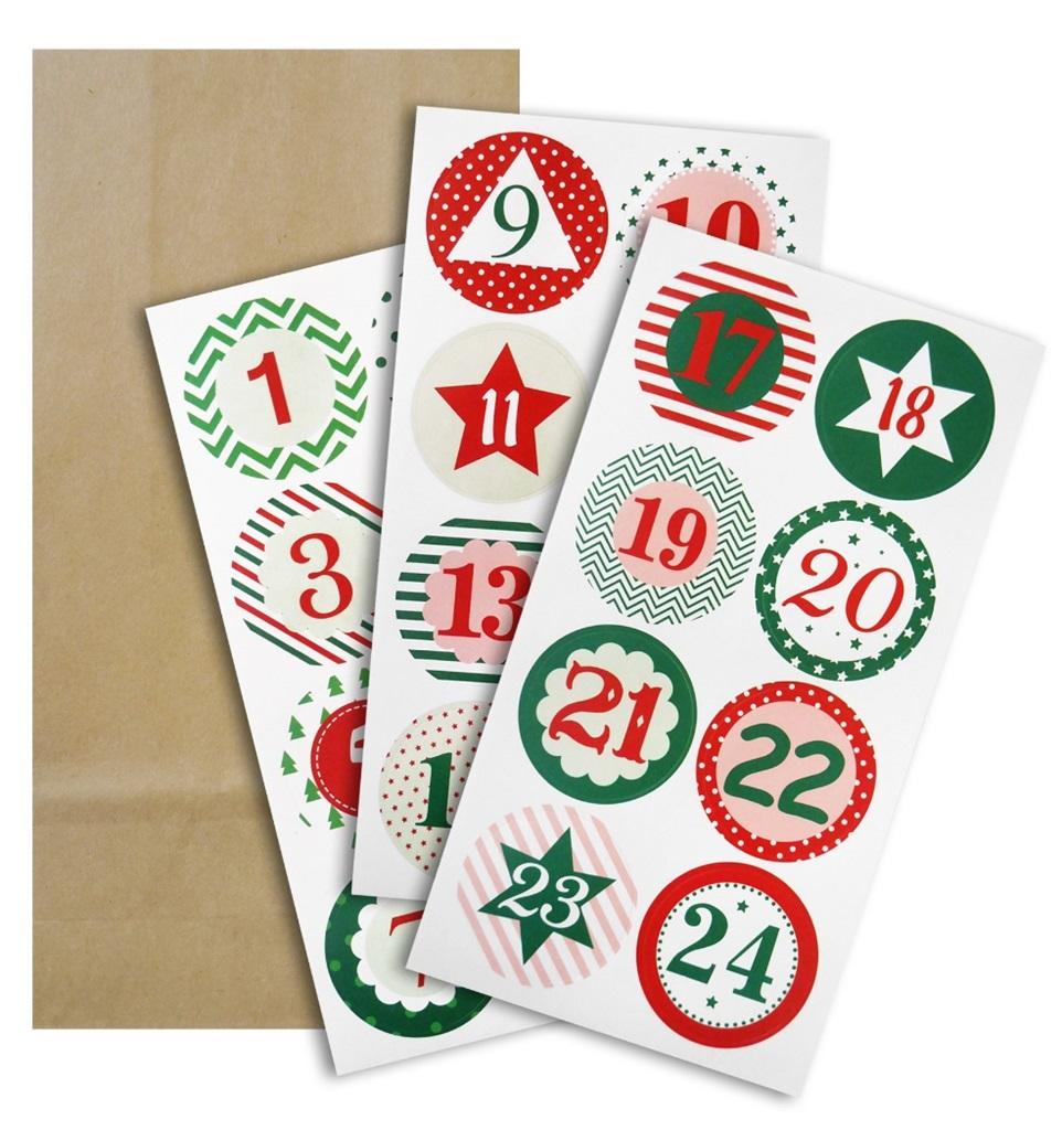 KALENDARZ ADWENTOWY - ZESTAW 24 PAPIEROWYCH TOREBEK I NAKLEJEK Z NUMERAMI