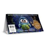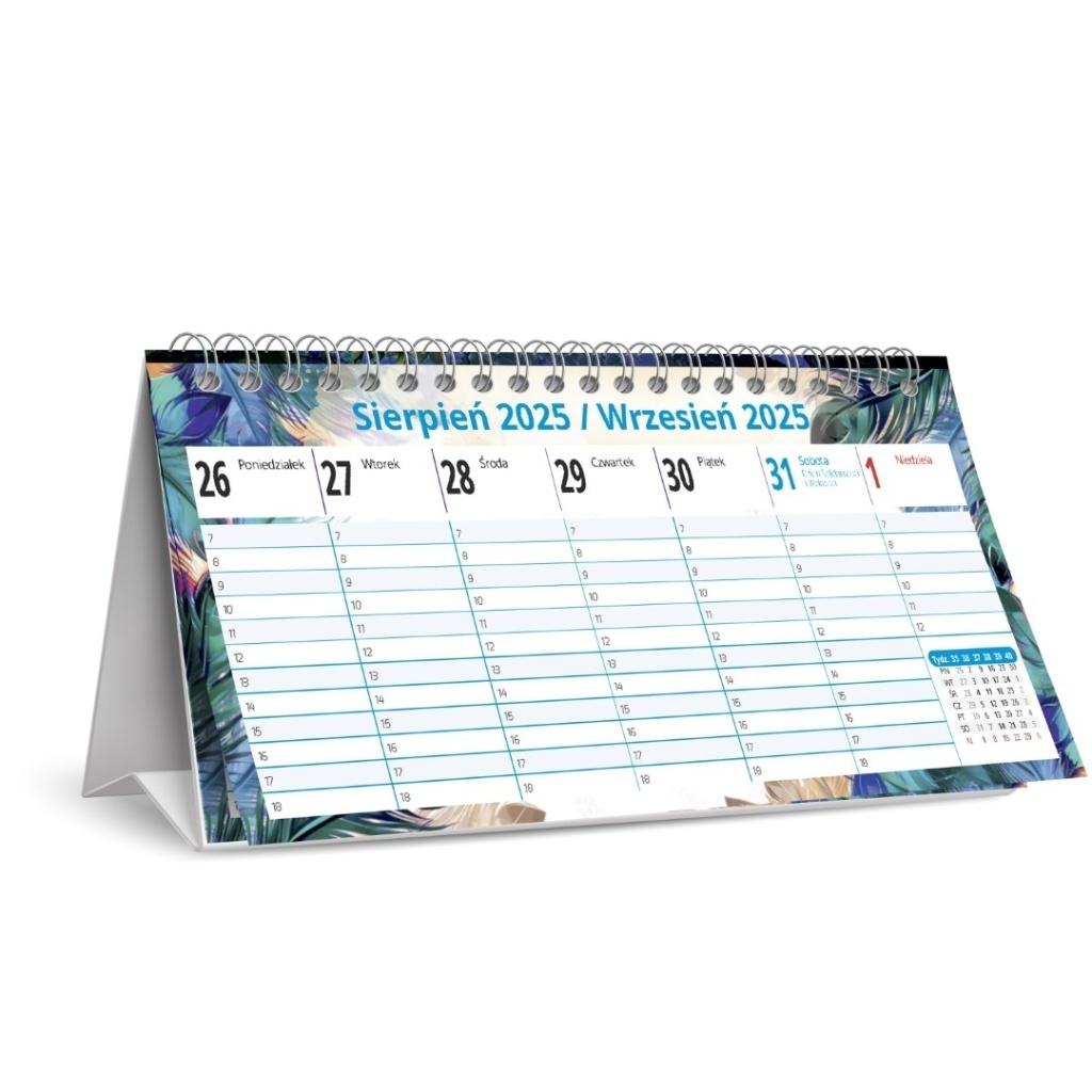 "Kalendarz biurkowy typu ""namiot.Układ kalendarium tygodniowy. 54 str, okładka miękka. Format całkowity 246 mm x 124 mm. Rozkład tygodniowy, zadruk full kolor, łączenie spiralą po długim boku, podstawa karton 300g, kalendarium offset 80g,"